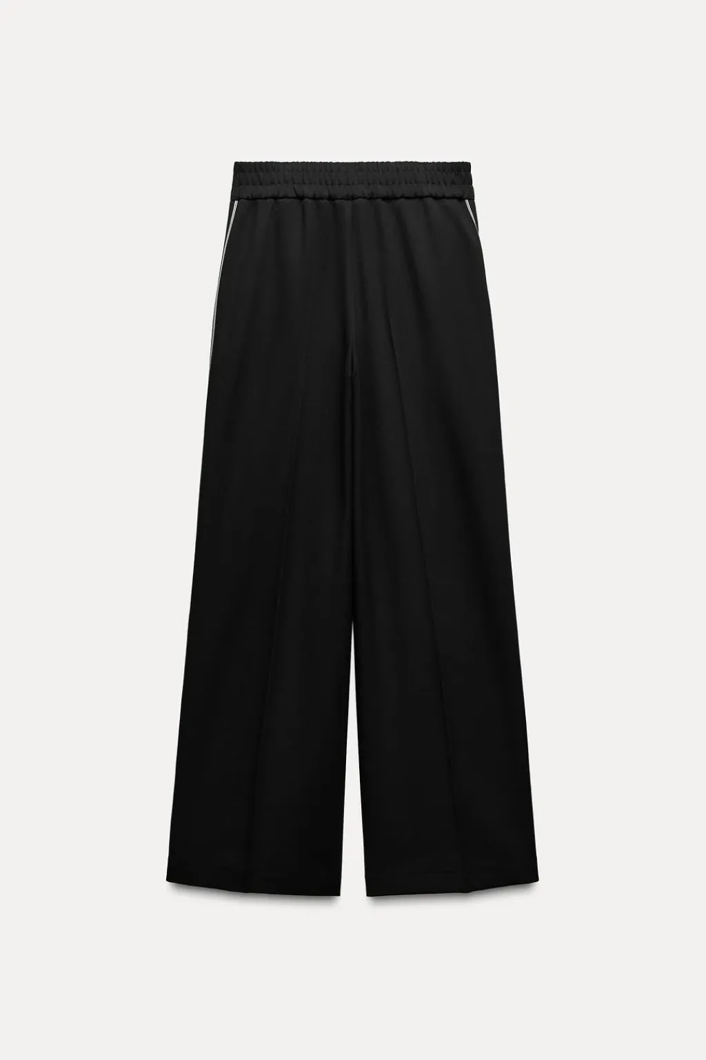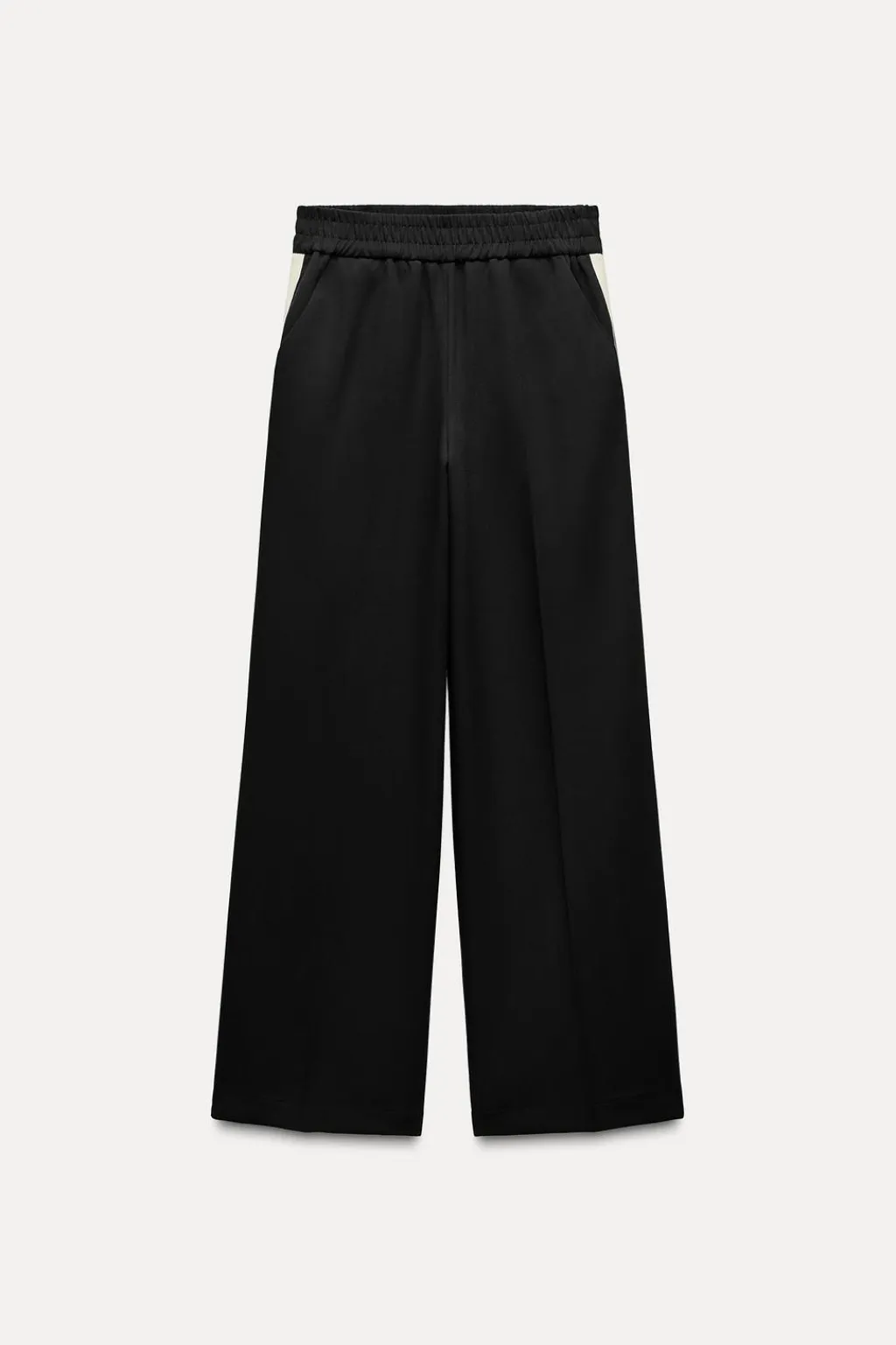Pantalón de tiro alto con cintura elástica. Bolsillos laterales. Detalle de banda lateral combinada a contraste. Pernera ancha.