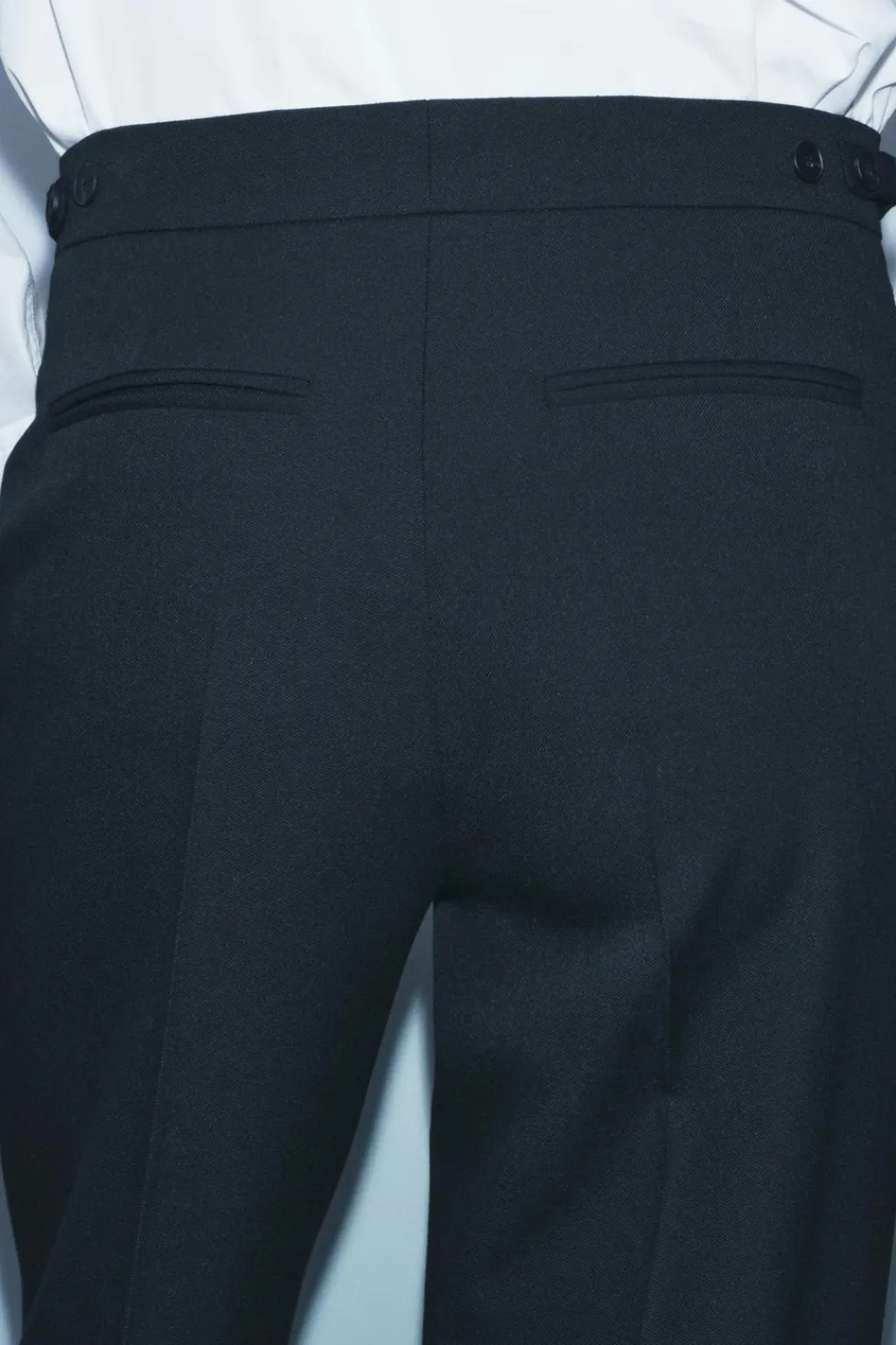 Pantalón de tiro medio y cintura ajustable con trabilla y botones. Bolsillos laterales. Detalle de raya planchada. Cierre frontal con cremallera, botón y gancho metálico.