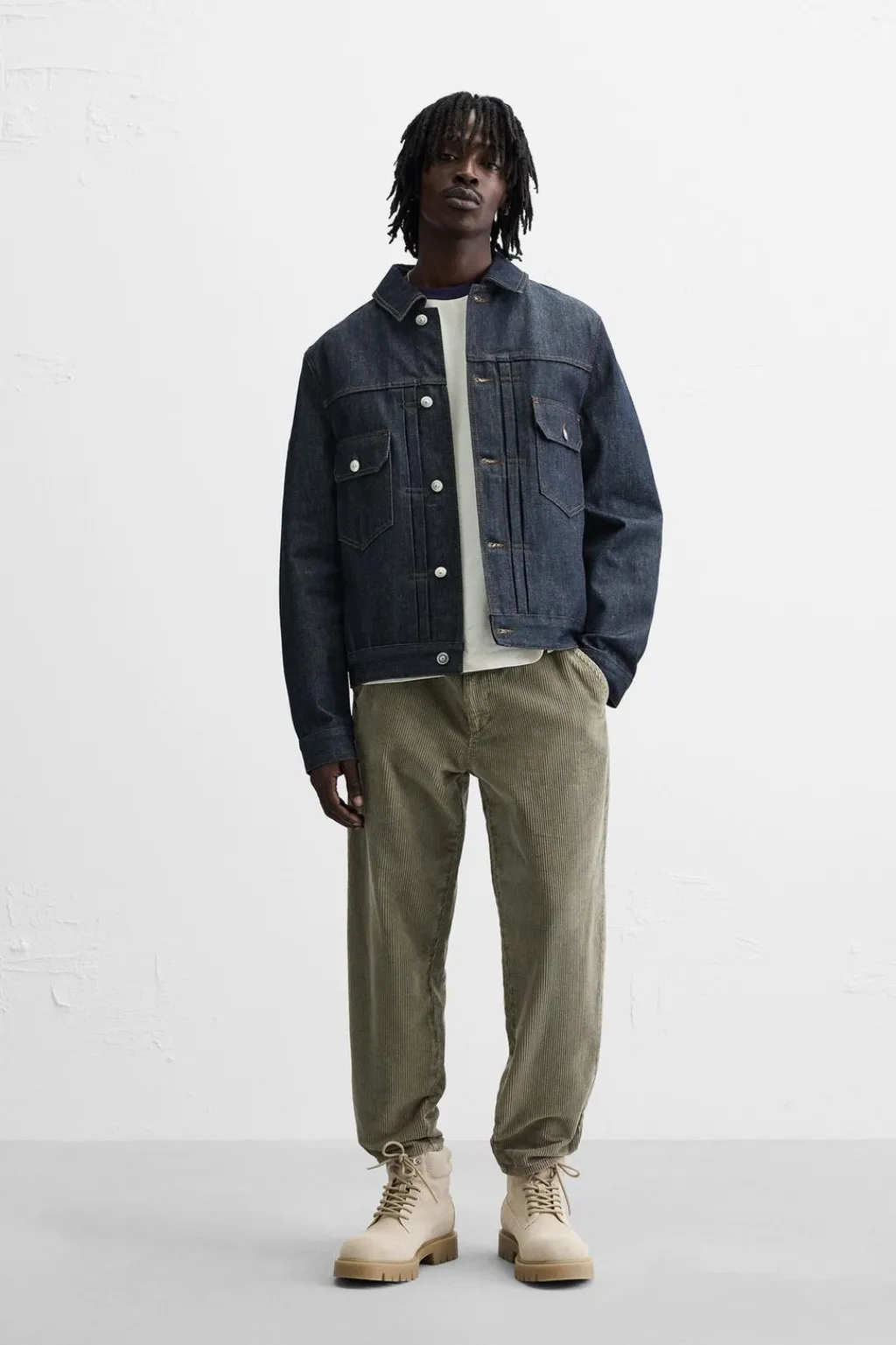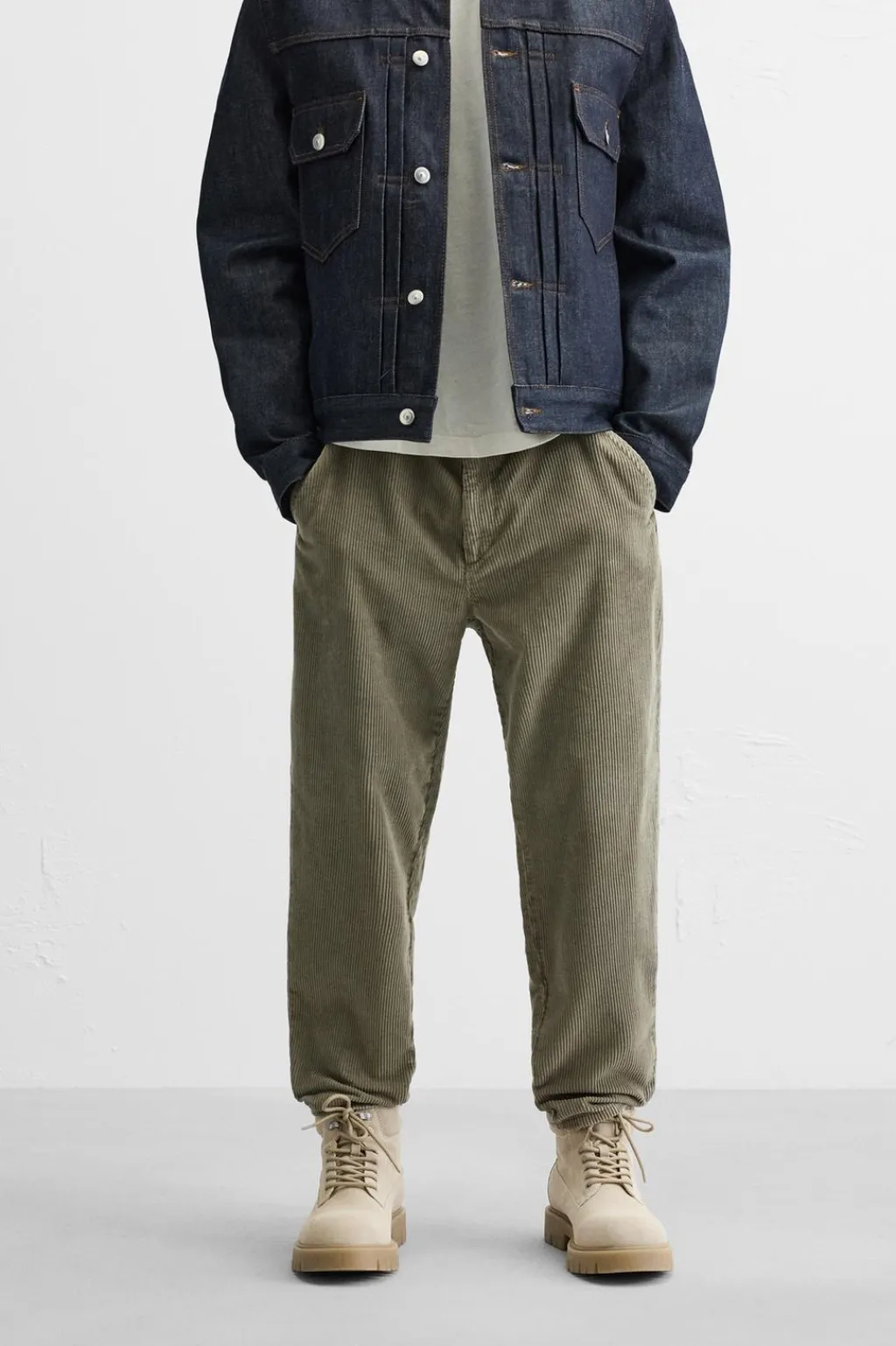Pantalón carrot fit confeccionado en pana de algodón. Bolsillos frontales y detalle de bolsillos traseros de plastrón. Cierre frontal con cremallera y botón.