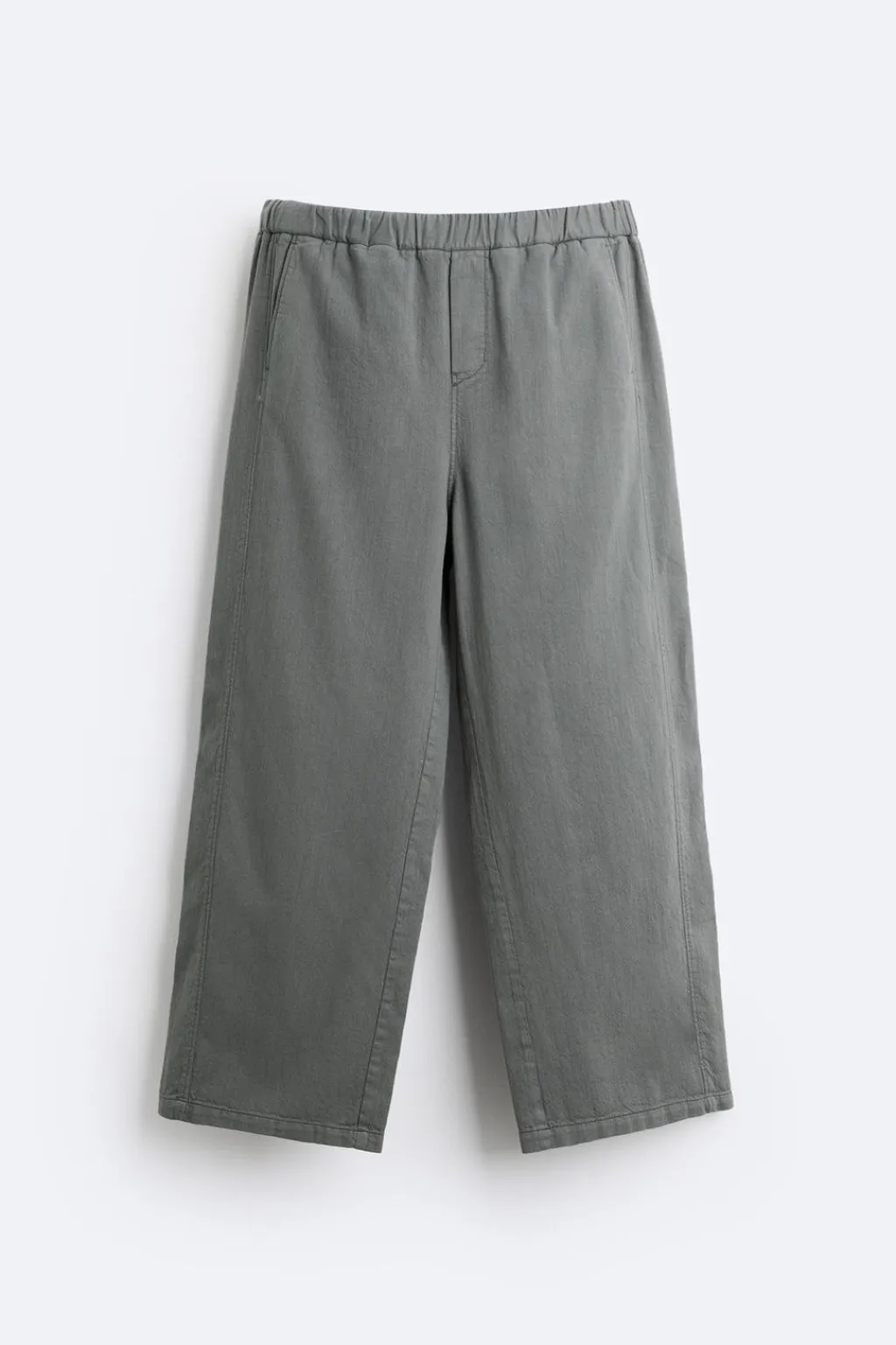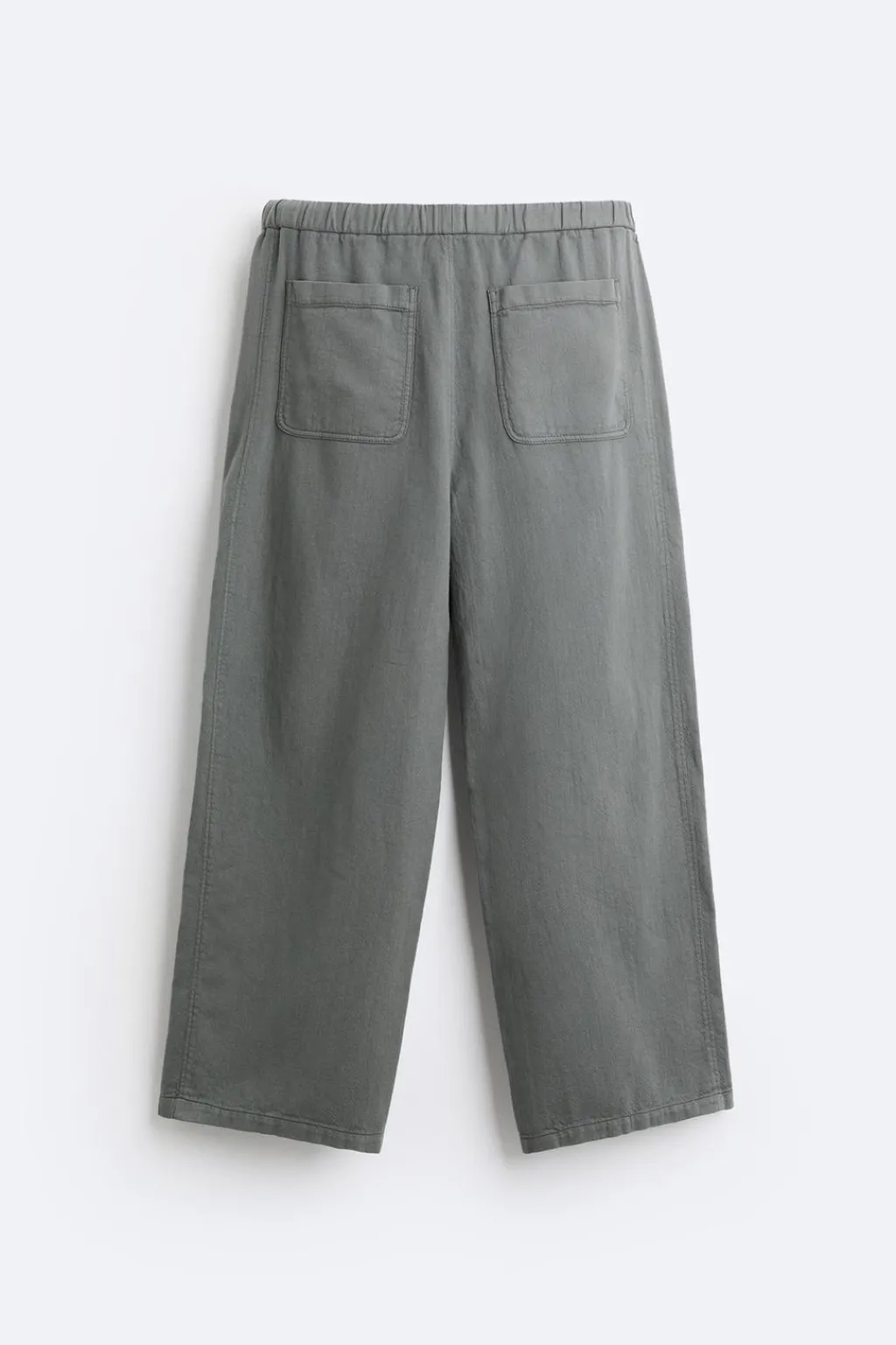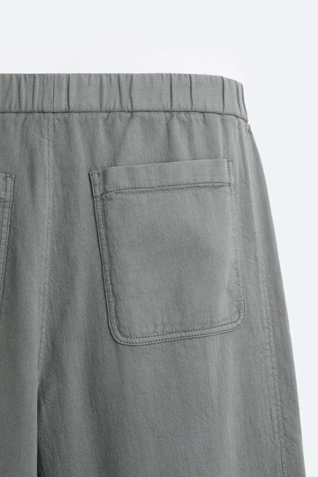 Pantalón relaxed fit confeccionado en tejido fluido de algodón. Cintura elástica ajustable con cordón interior. Bolsillos frontales y detalle de bolsillos plastrón en espalda.