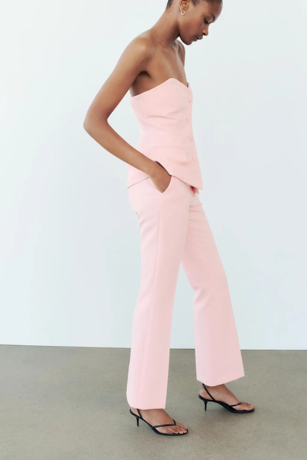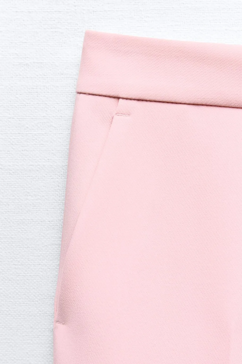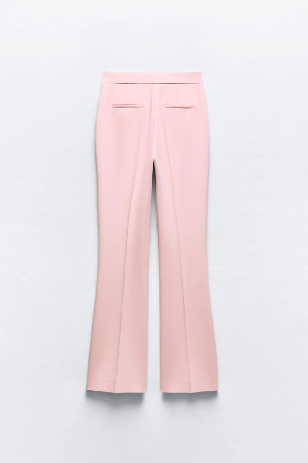 Pantalón de tiro alto con bolsillos delanteros y falsos bolsillos de vivo en espalda. Pernera larga acabada en evasé. Cierre frontal con cremallera, botón interior y gancho.