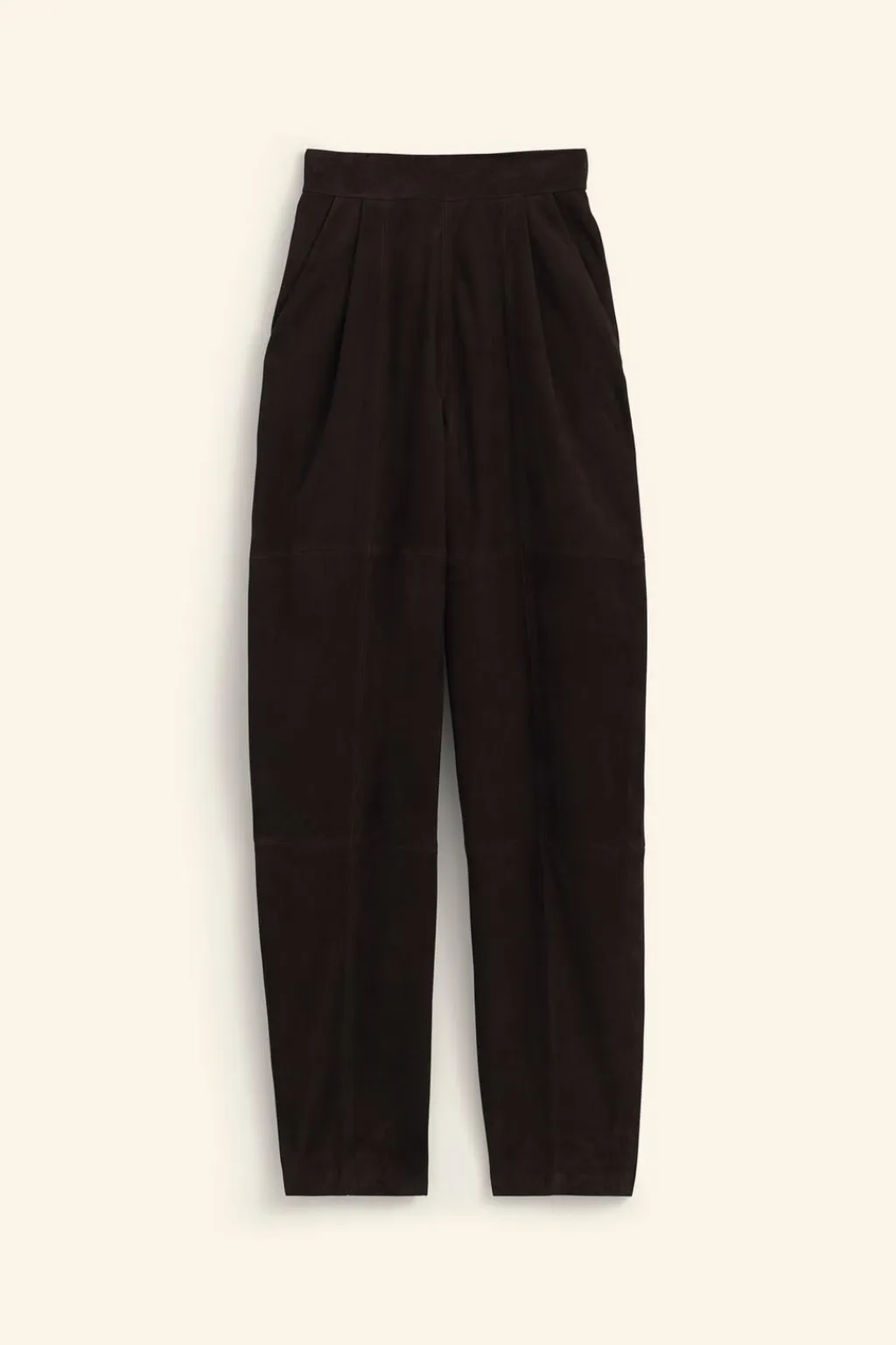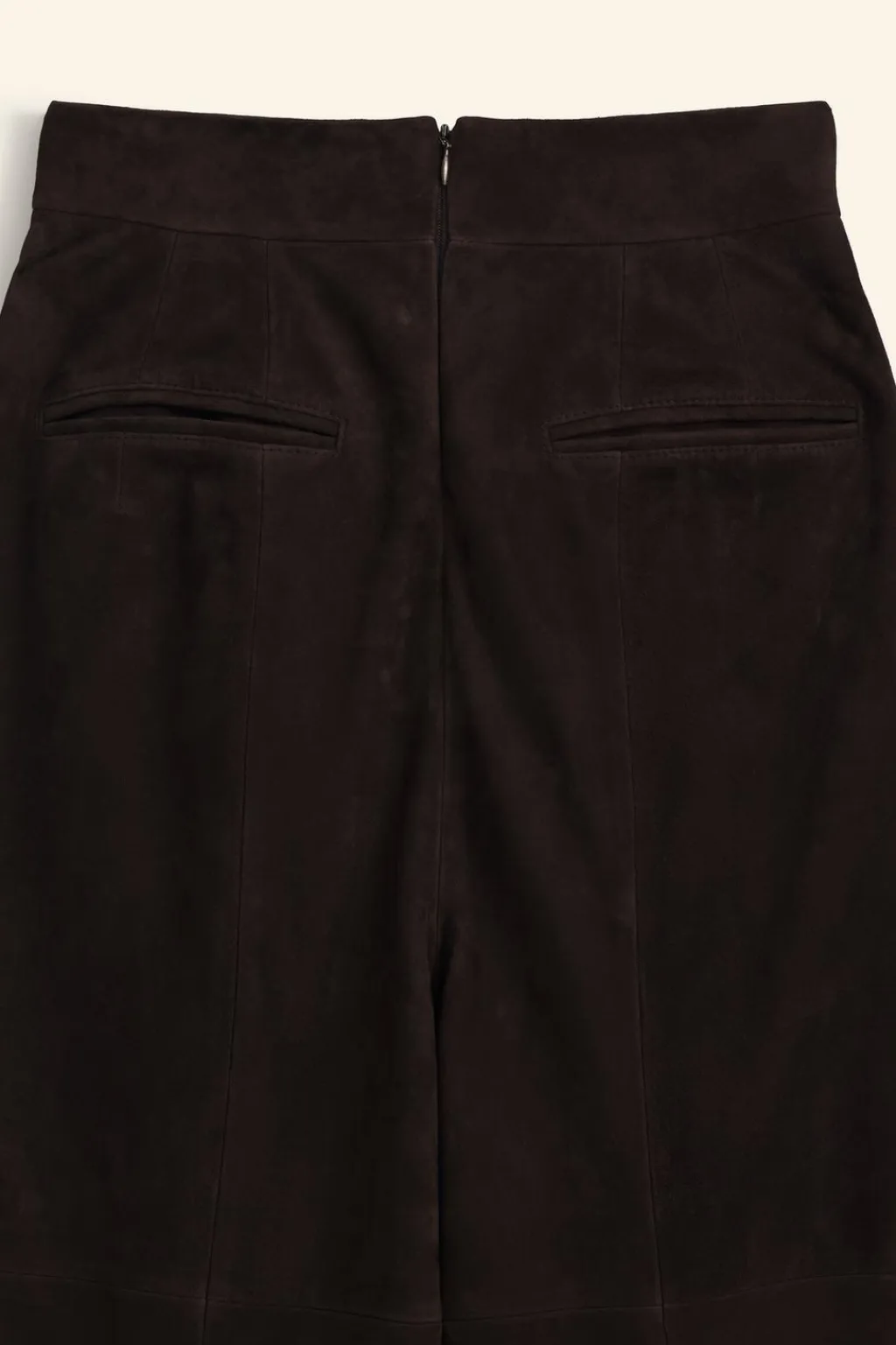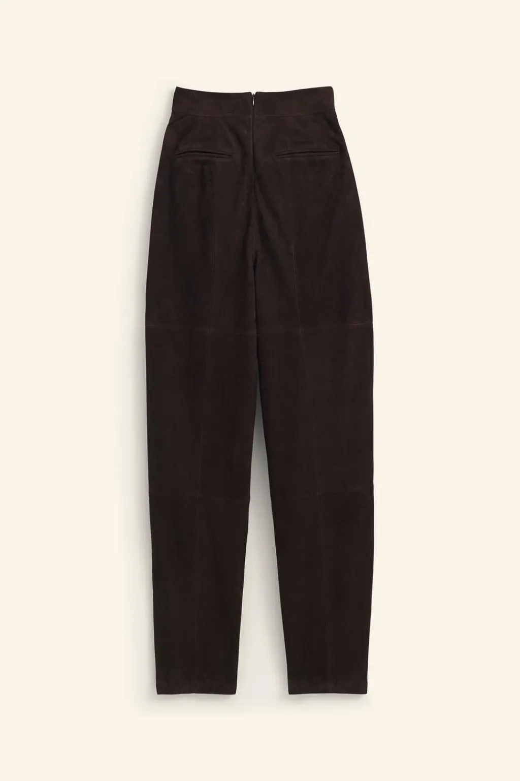 Pantalón de tiro alto realizado en piel de ante 100%. Bolsillos laterales y de vivo en espalda. Detalle de pinzas en delantero. Cierre en espalda con cremallera oculta en costura.