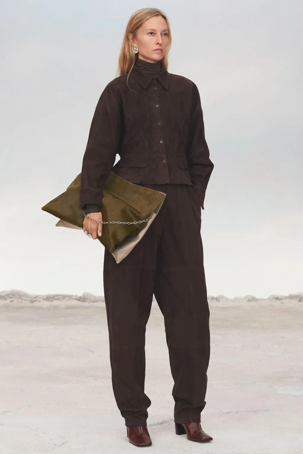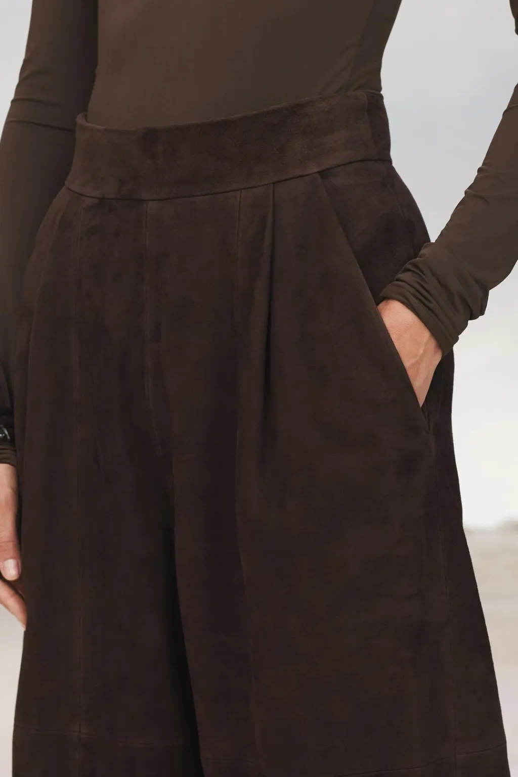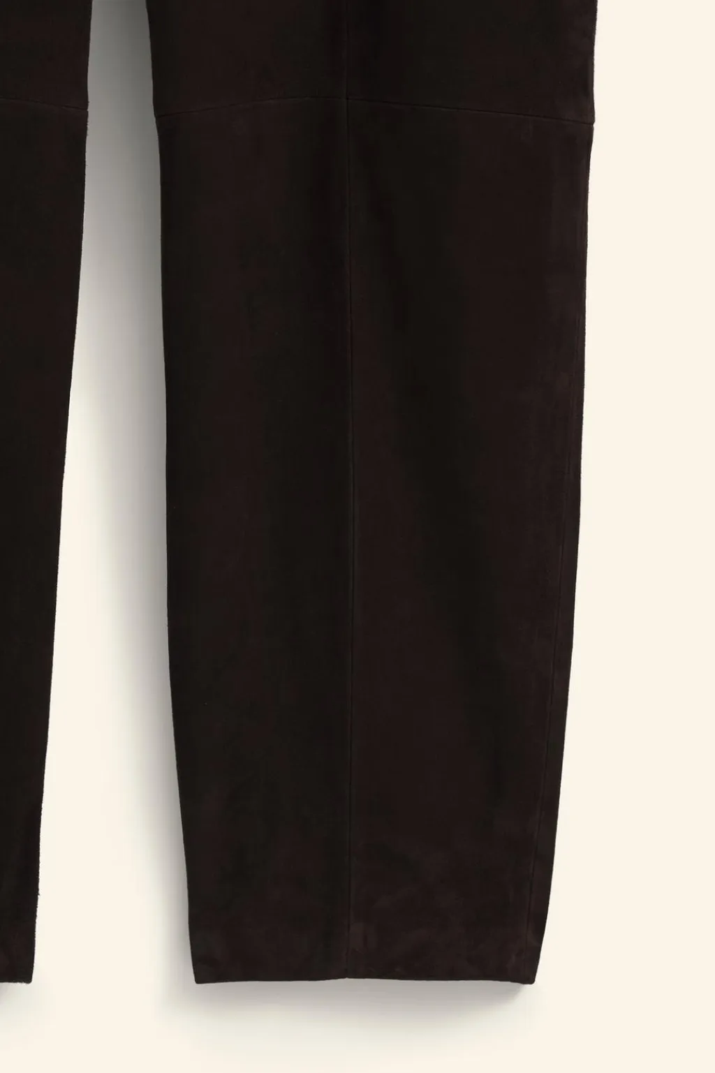 Pantalón de tiro alto realizado en piel de ante 100%. Bolsillos laterales y de vivo en espalda. Detalle de pinzas en delantero. Cierre en espalda con cremallera oculta en costura.