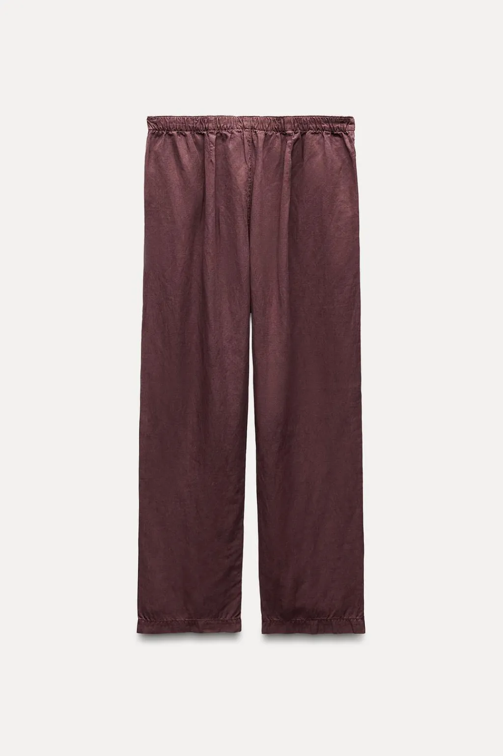 Pantalón pijamero confeccionado en mezcla de lyocell y con lino 20%. Tiro medio y cintura con elástico en espalda ajustable con cordones. Bolsillos laterales ocultos en costura. Pierna recta.