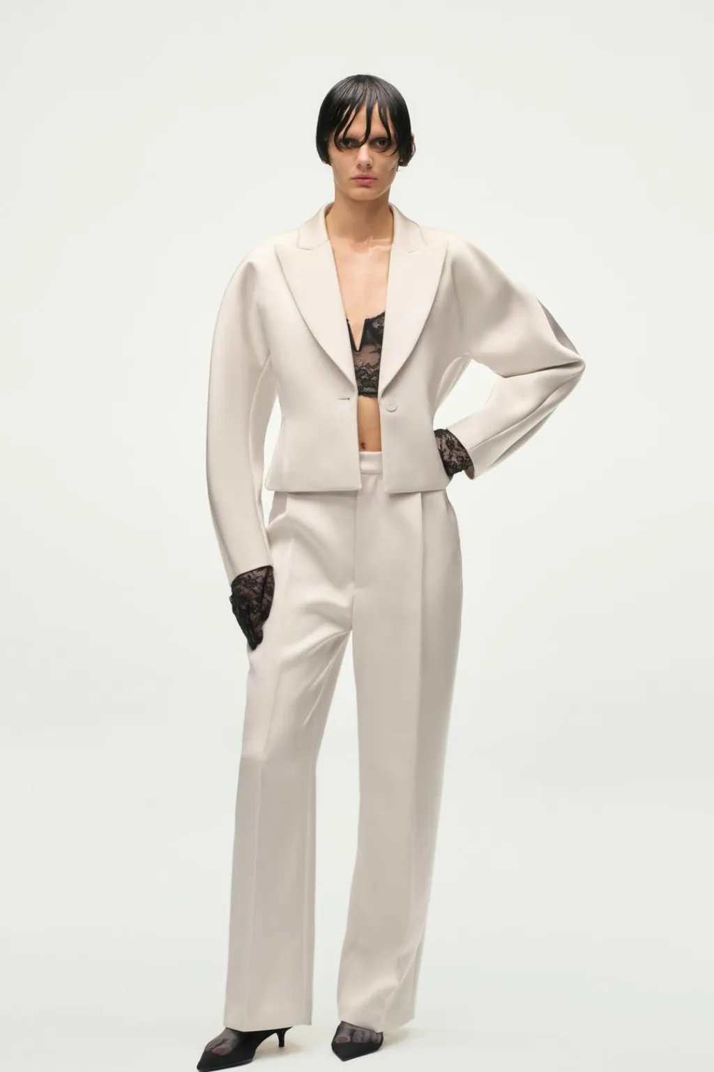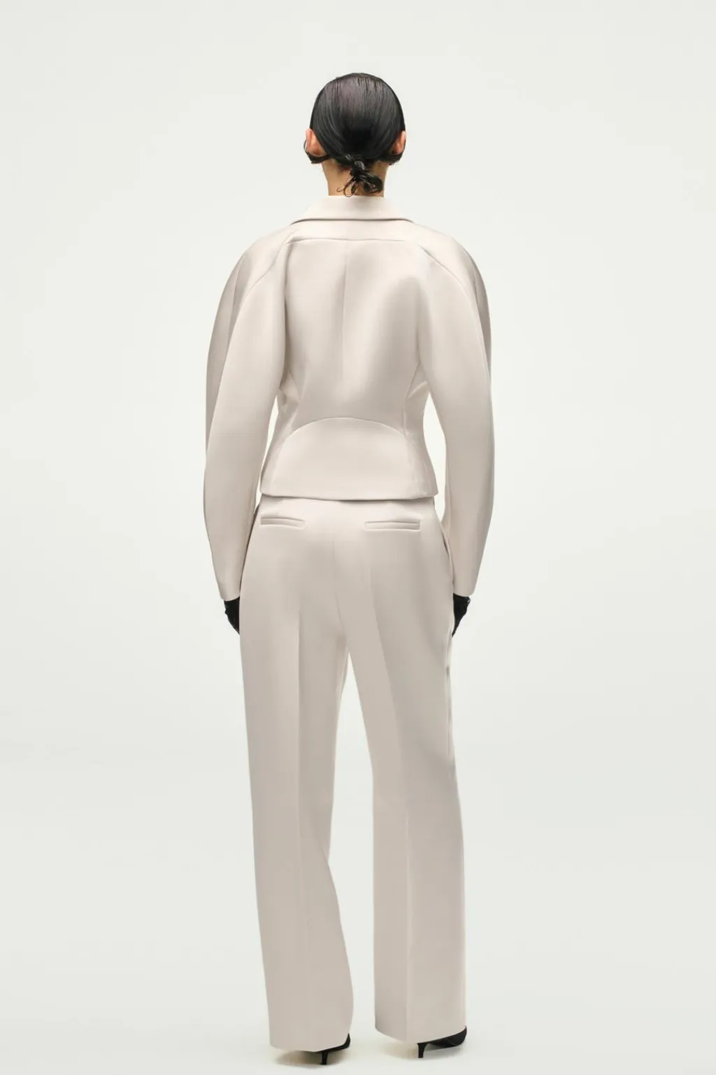 Pantalón satinado de tiro medio. Bolsillos laterales ocultos en costura y de vivo en espalda. Detalle de pinzas en delantero. Cierre frontal con cremallera, botón y gancho metálico.