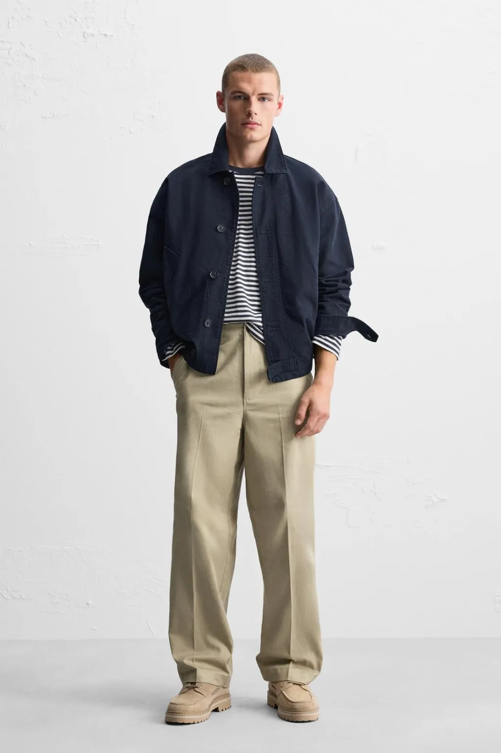 Pantalón straight fit confeccionado en tejido de algodón. Cintura ajustable con trabillas y cremallera lateral. Bolsillos frontales y detalle de bolsillos traseros de plastrón. Cierre frontal con cremallera y botón.