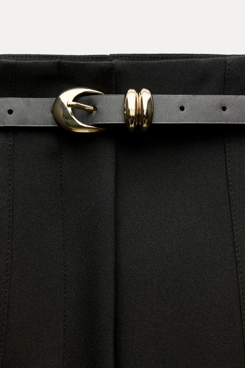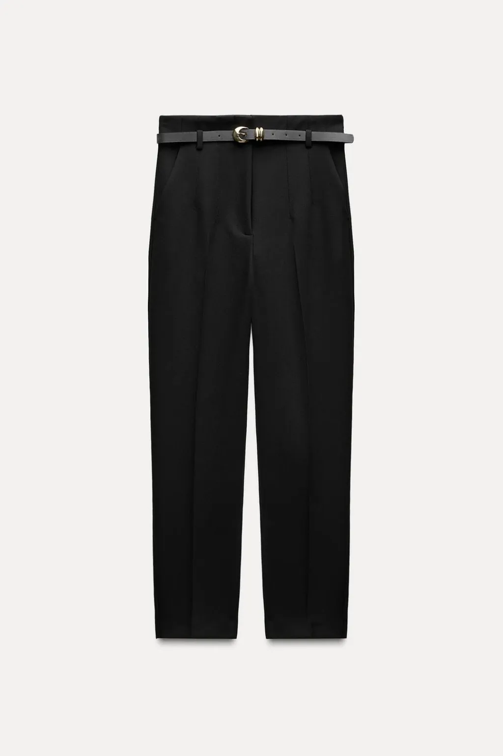 Pantalón de tiro alto con cinturón. Bolsillos delanteros. Pernera recta. Cierre frontal con cremallera, botón interior y gancho.
