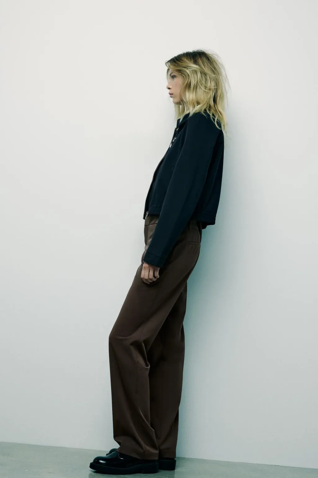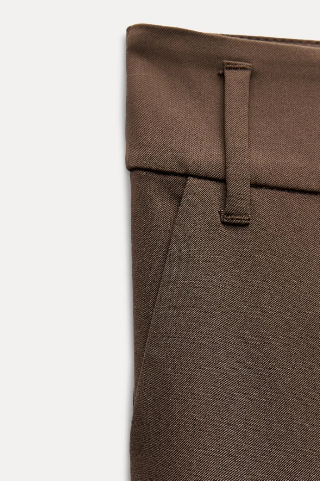 Pantalón de tiro bajo con cintura ancha. Bolsillos laterales y falsos bolsillos de vivo en espalda. Cierre frontal con cremallera, botón interior y ganchos metálicos.