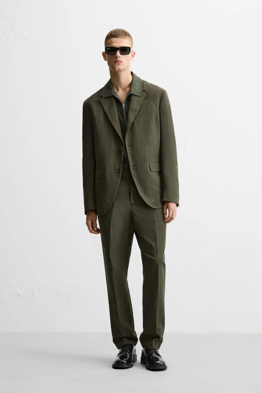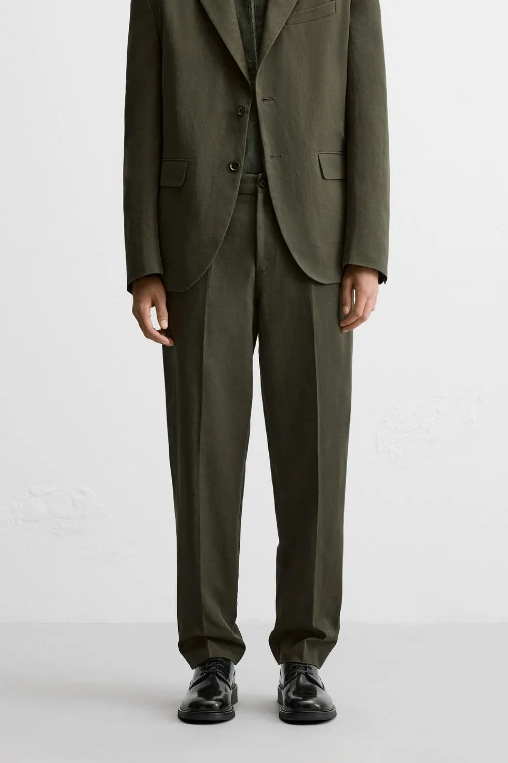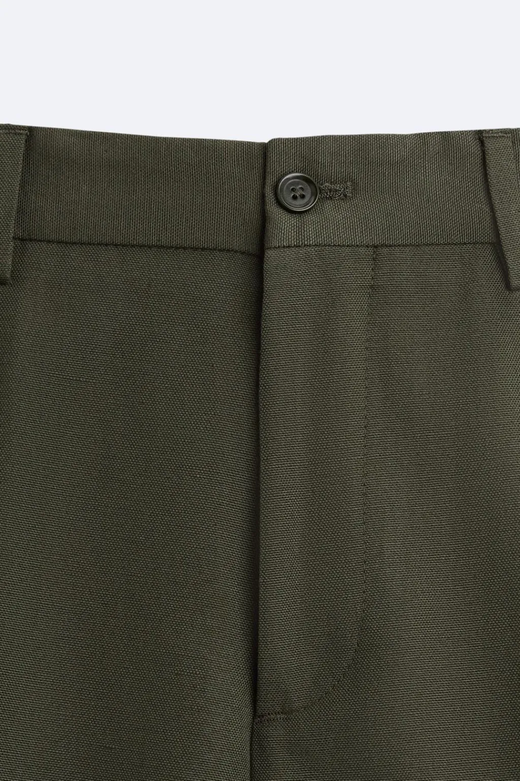 Pantalón slim fit confeccionado en tejido con mezcla de algodón y lino. Bolsillos frontales y detalle de bolsillos traseros de doble vivo con botón. Cierre frontal con cremallera y botón.