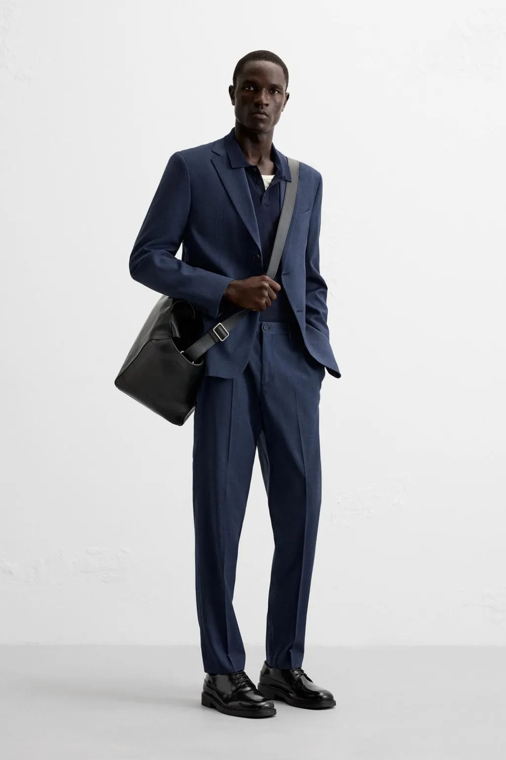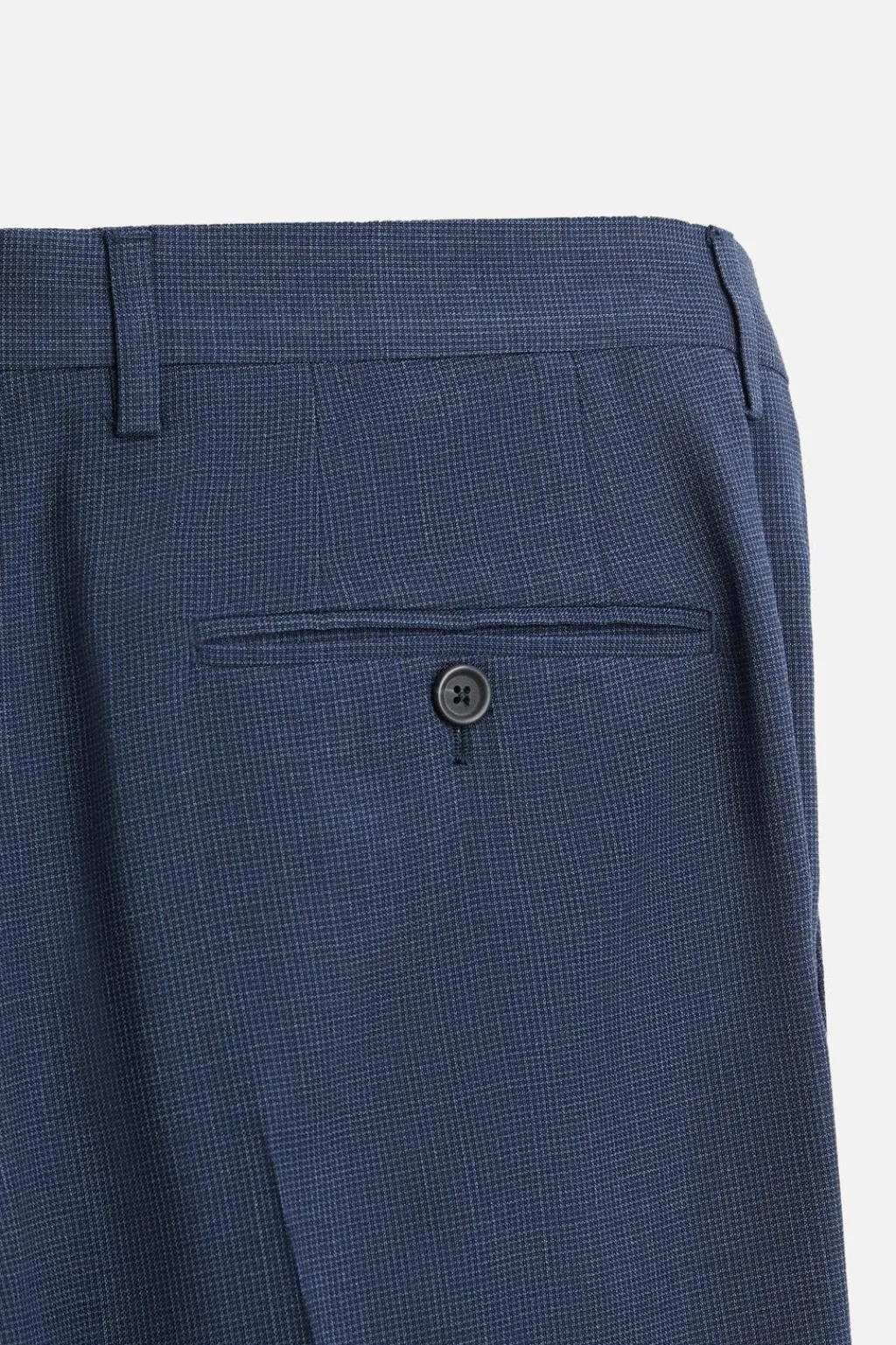Pantalón slim fit confeccionado en tejido con lana. Bolsillos frontales y detalle de bolsillos traseros de doble vivo con botón. Cierre frontal con cremallera y botón.
