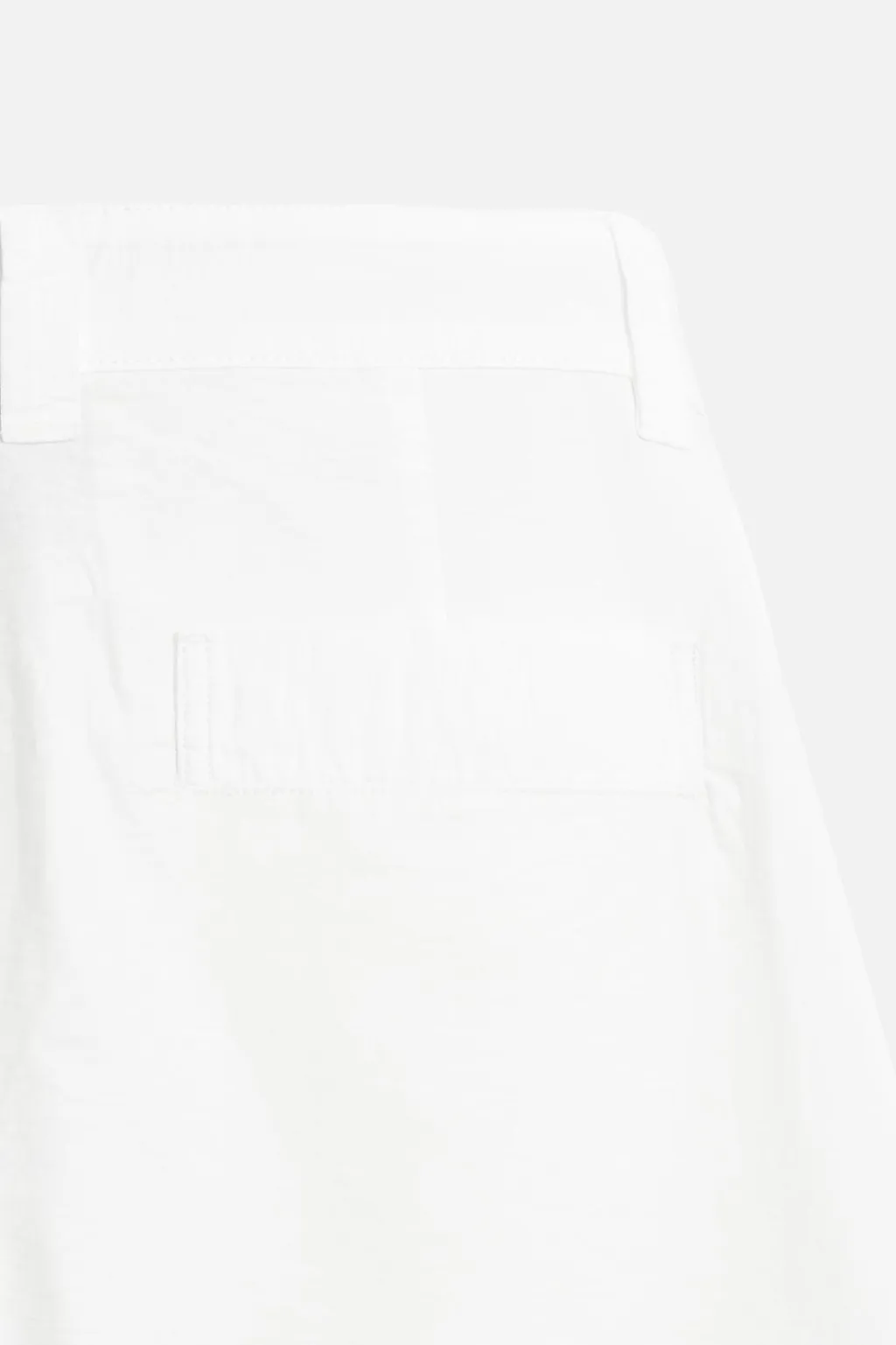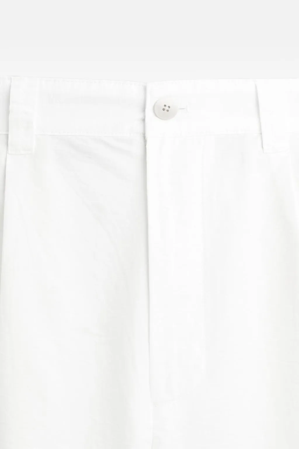 Pantalón wide fit confeccionado en tejido con mezcla de algodón. Cintura con detalle de pliegues frontales. Bolsillos en delantero y detalle de bolsillos traseros de vivo. Cierre frontal con cremallera y botón.