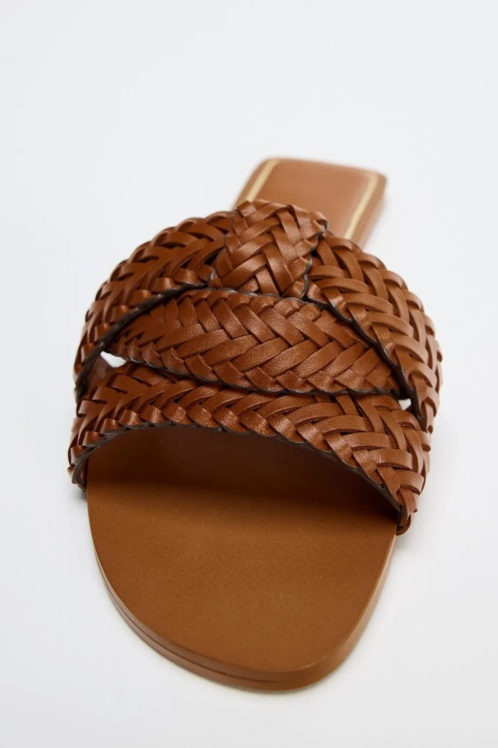Zapato tipo sandalia plana en piel. Detalle de tiras cruzadas en la parte delantera.
