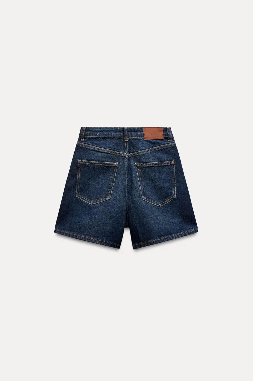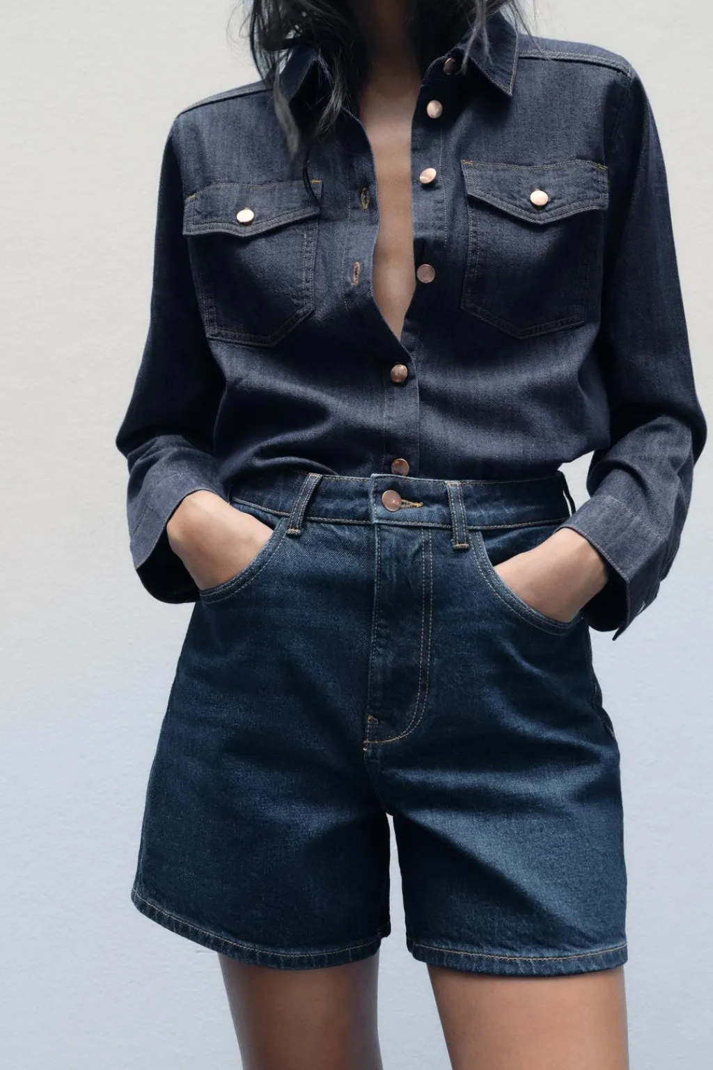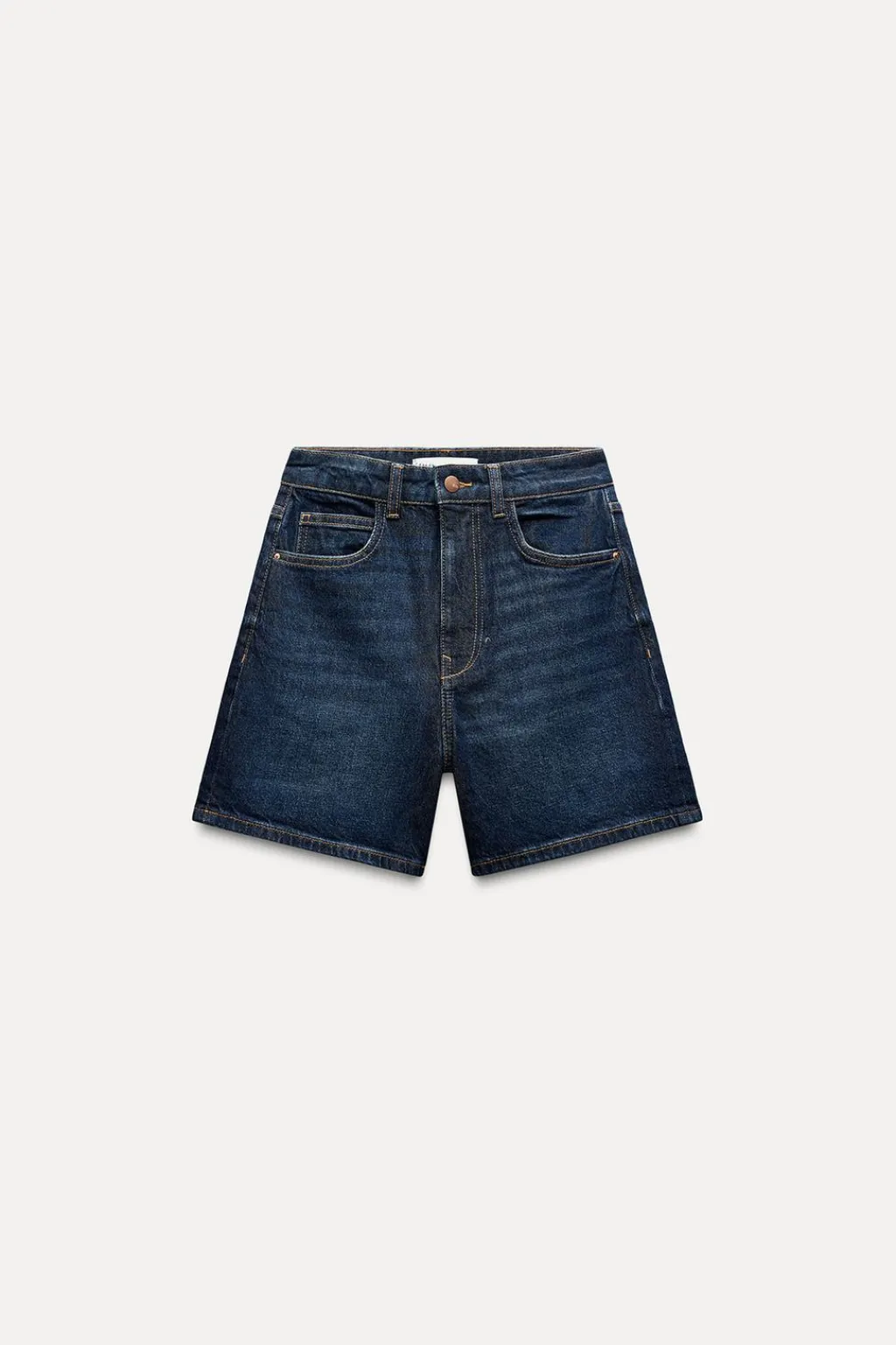 Shorts de tiro alto con cinco bolsillos. Efecto lavado. Cierre frontal con cremallera y botón.