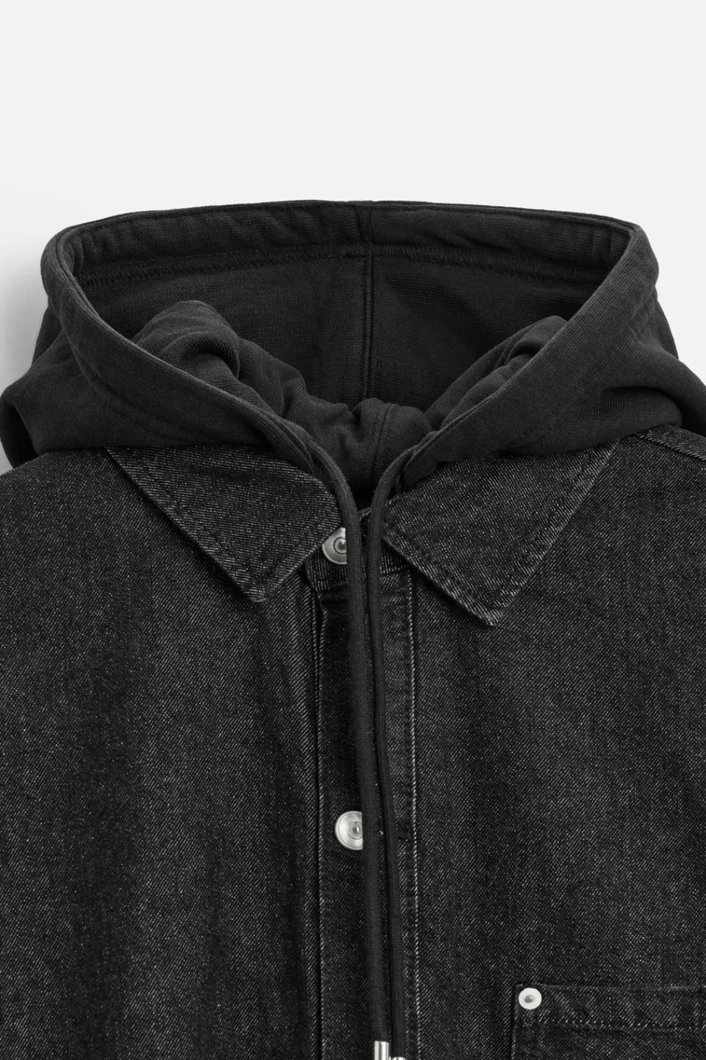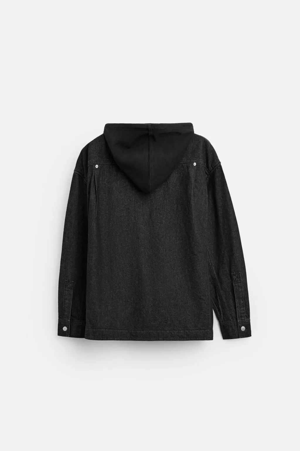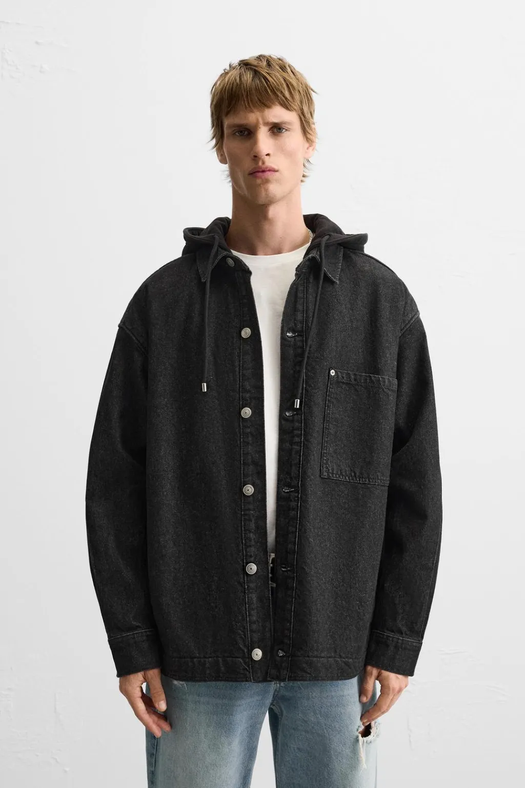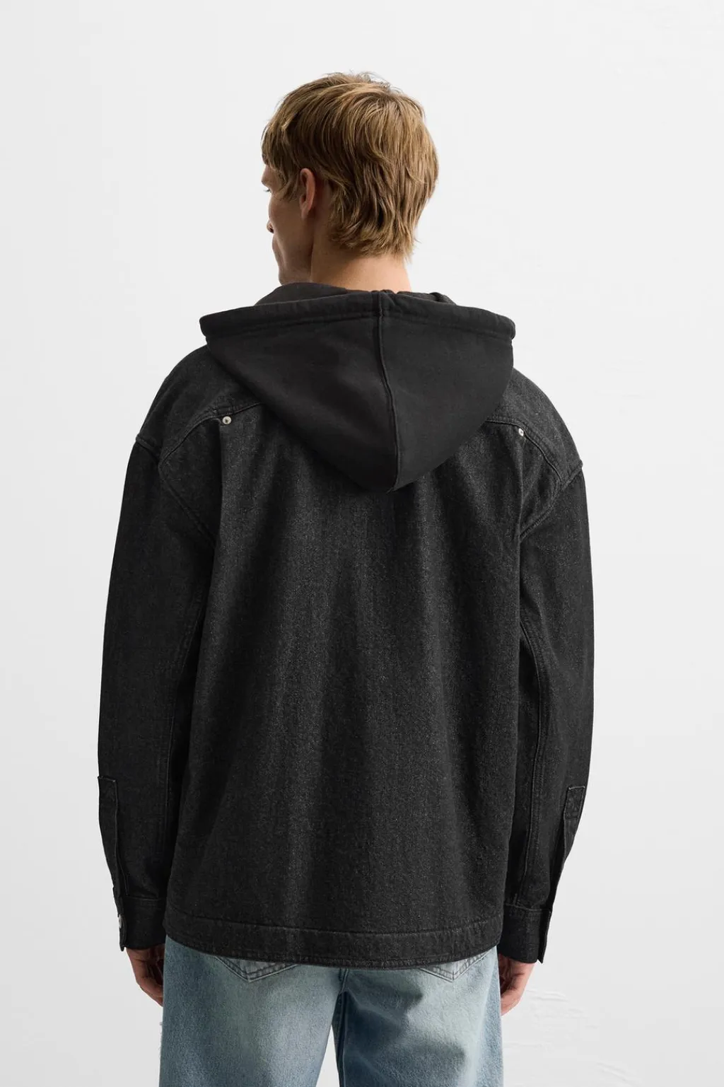 Sobrecamisa relaxed fit confeccionada en tejido denim. Cuello solapa con capucha combinada a contraste y manga larga acabada en puño con botón. Bolsillo plastrón en pecho y laterales en cadera. Cierre frontal de botonadura.