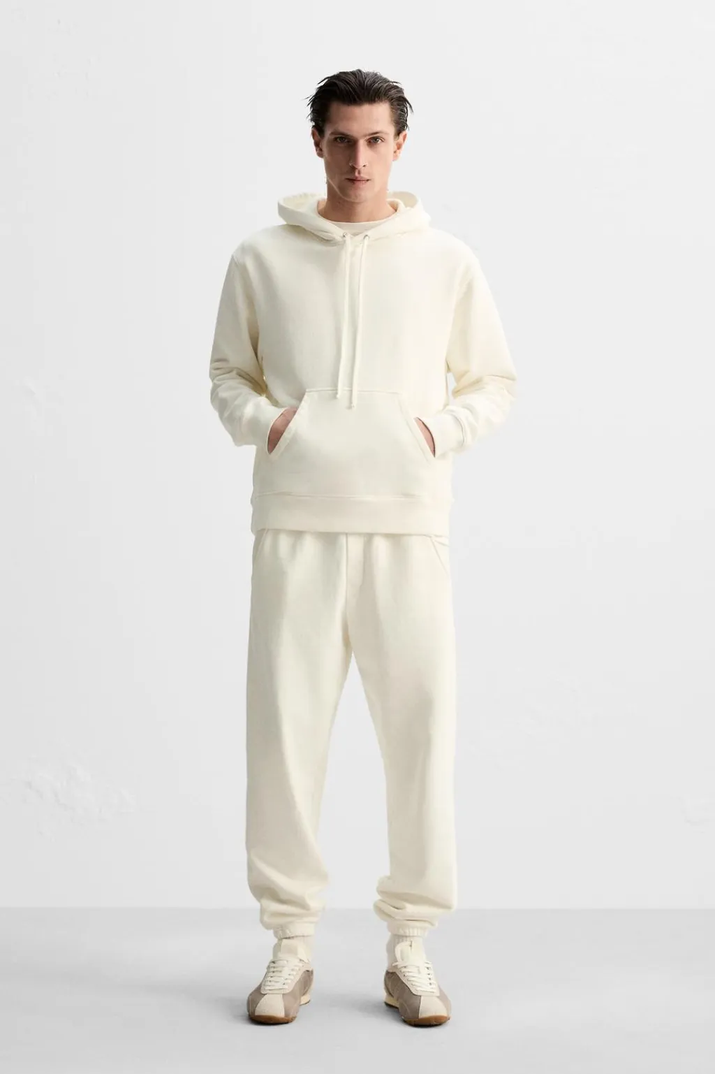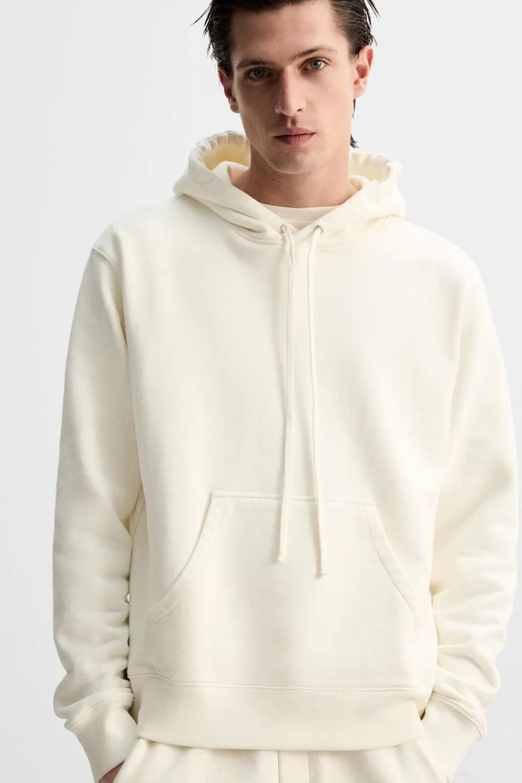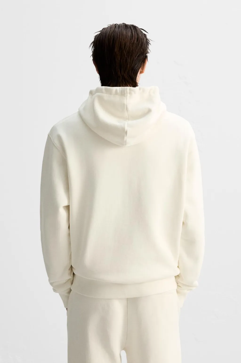 Sudadera hoodieregular fit confeccionada en tejido de algodón compacto con el interior acabado rizo. Efecto lavado. Cuello con capucha ajustable y manga larga. Bolsillo frontal tipo canguro. Acabados en rib.