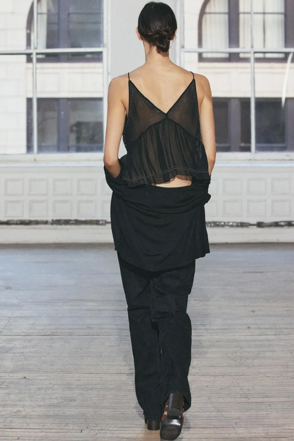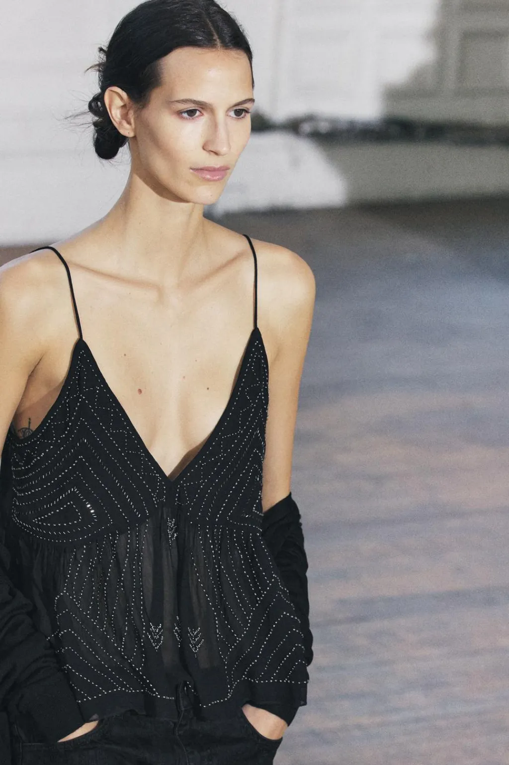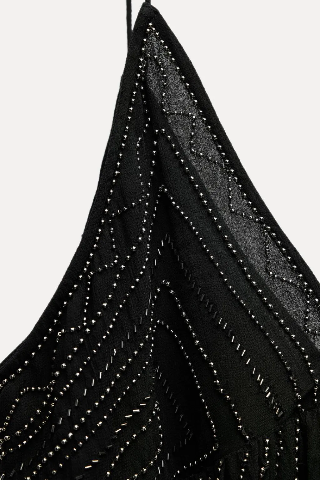 Top de escote pico y tirantes finos. Detalle de bordados con aplicación de abalorios.