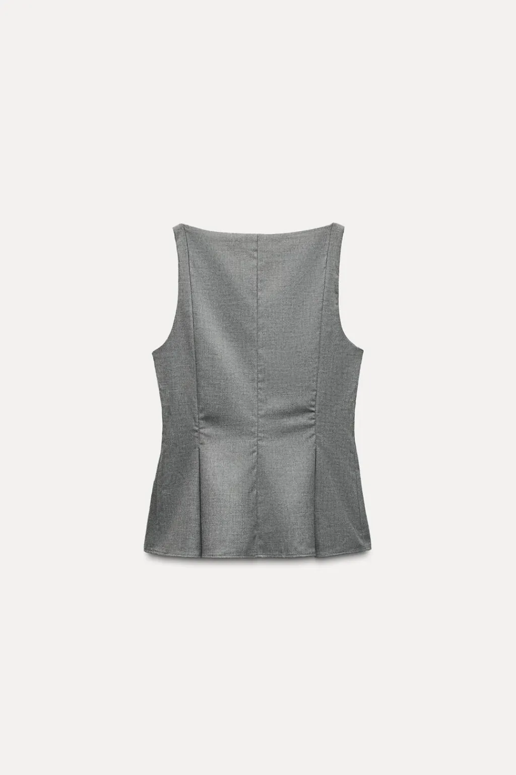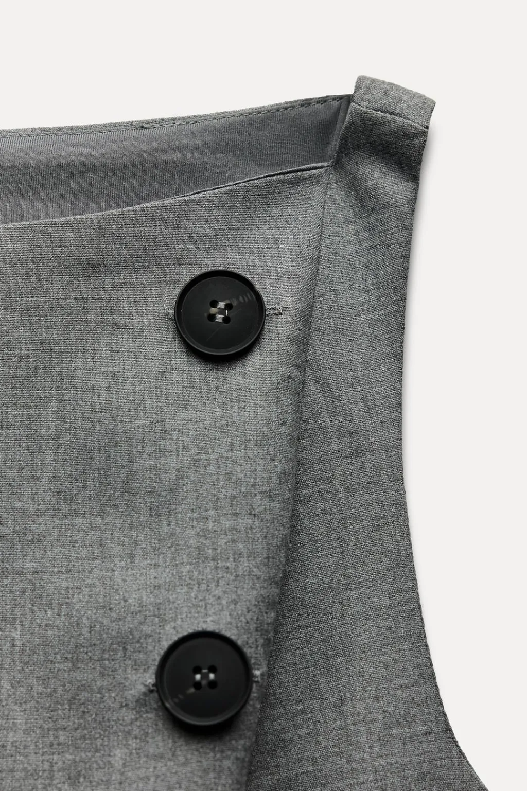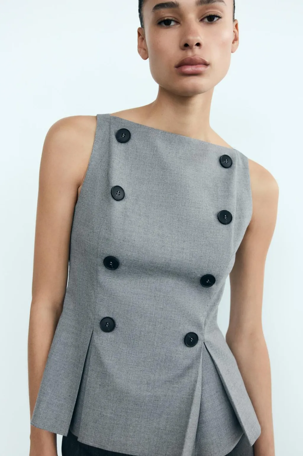 Top de cuello barco y manga sisa. Detalle de botones en delantero. Forro interior. Bajo acabado con pinzas. Cierre lateral con cremallera oculta en costura.