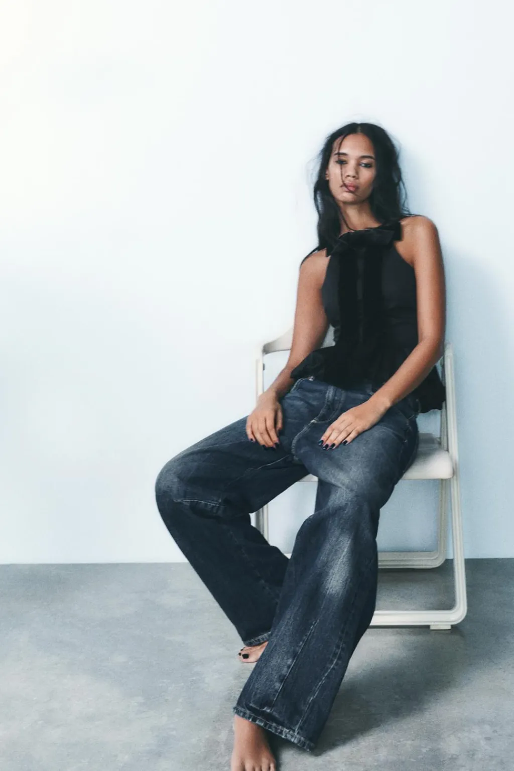 Top de escote recto y tirantes finos. Detalle de lazo combinado en terciopelo en delantero. Bajo acabado globo. Cierre en espalda con cremallera oculta en costura.
