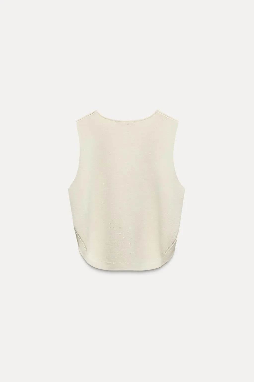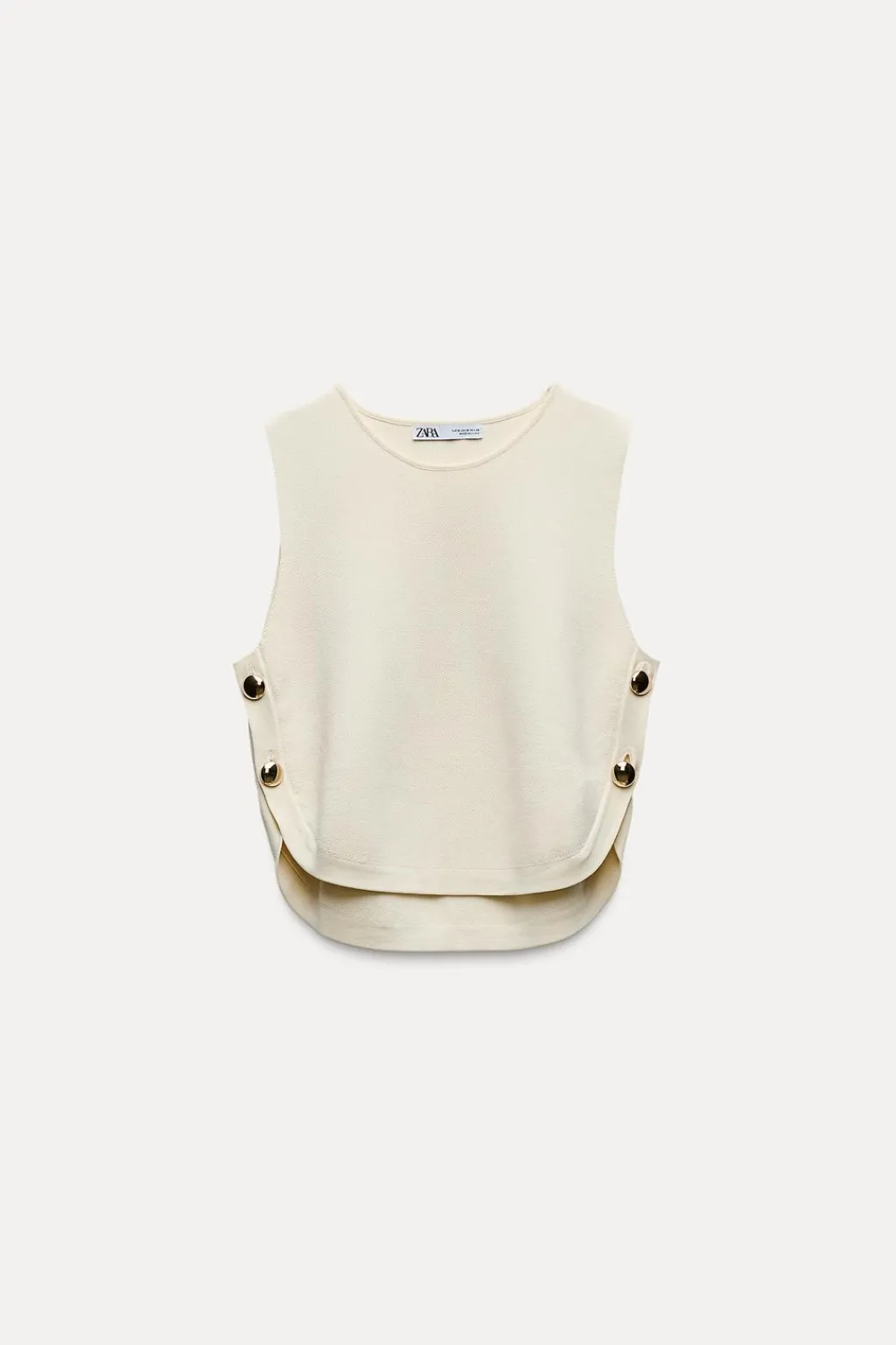 Top de punto liso con cuello redondo y manga sisa. Detalle de botones dorados laterales.