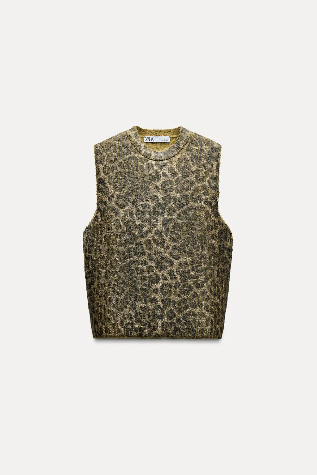 Top de cuello redondo y manga sisa. Detalle con tejido estampado metalizado.