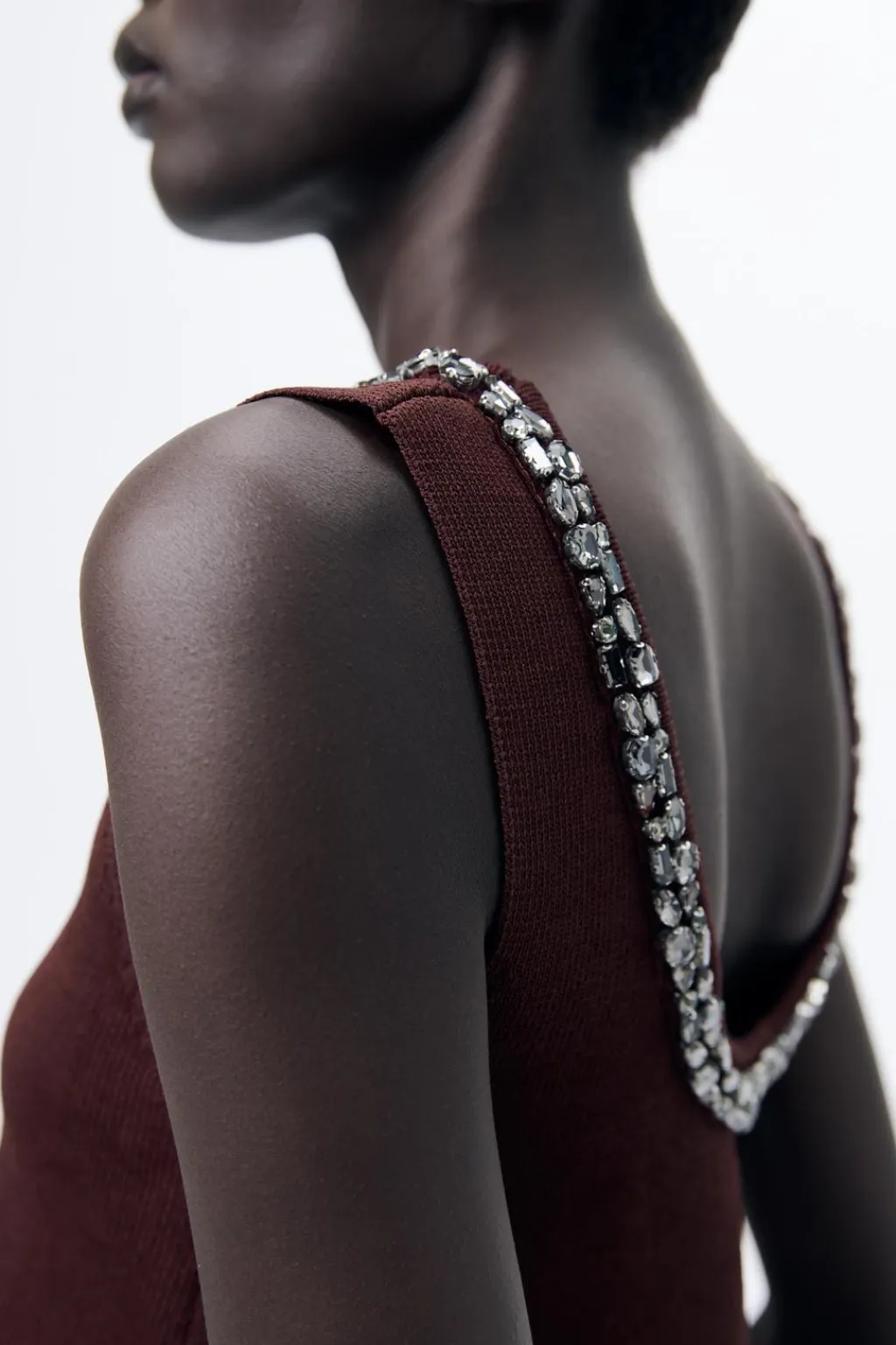 Top de escote redondo con aplicación de abalorios joya y manga sisa.