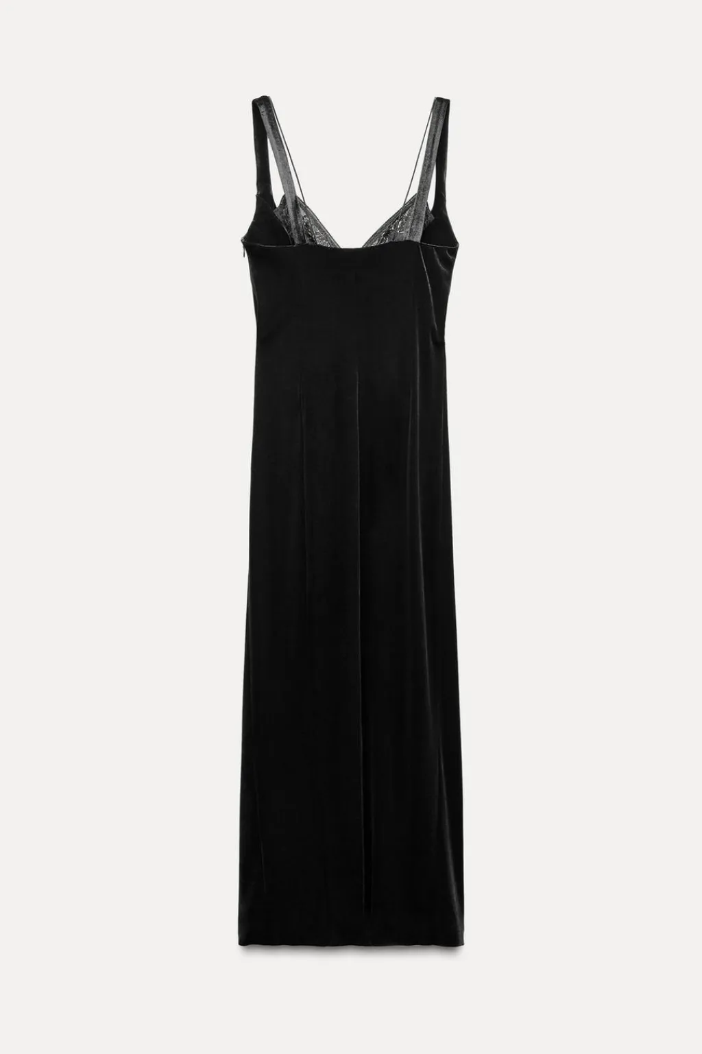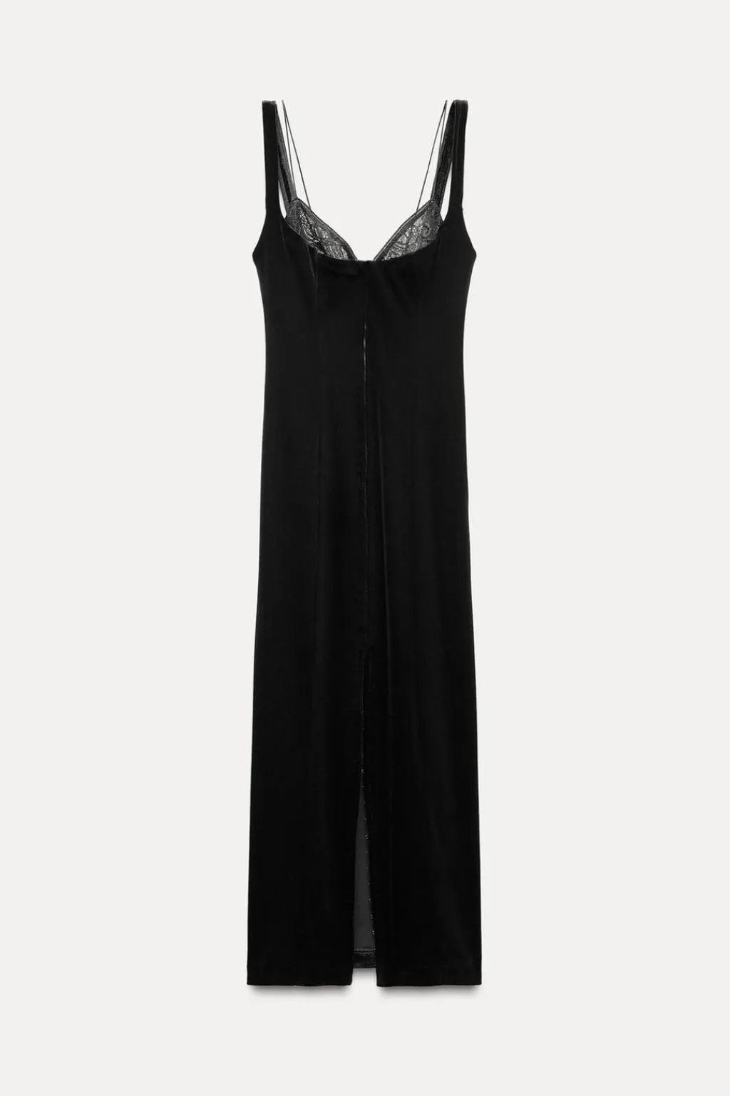 Vestido de escote pico con encaje y doble tirante combinado. Detalle de falsos corchetes delanteros. Bajo con abertura frontal. Cierre lateral con cremallera oculta en costura.