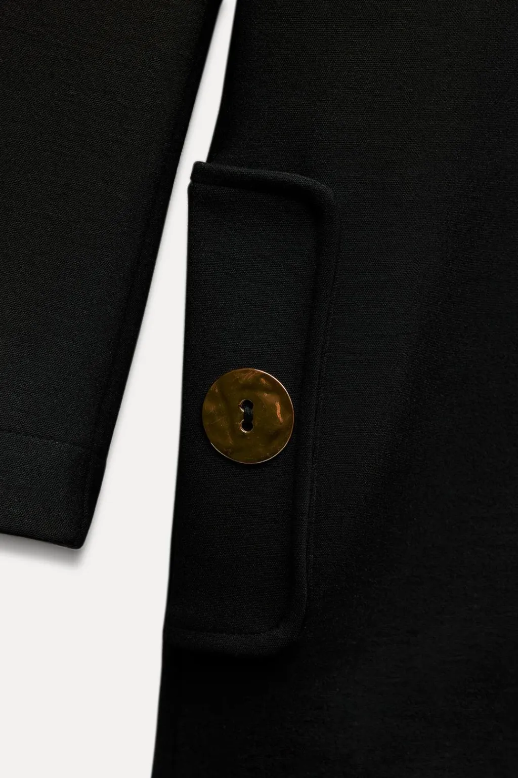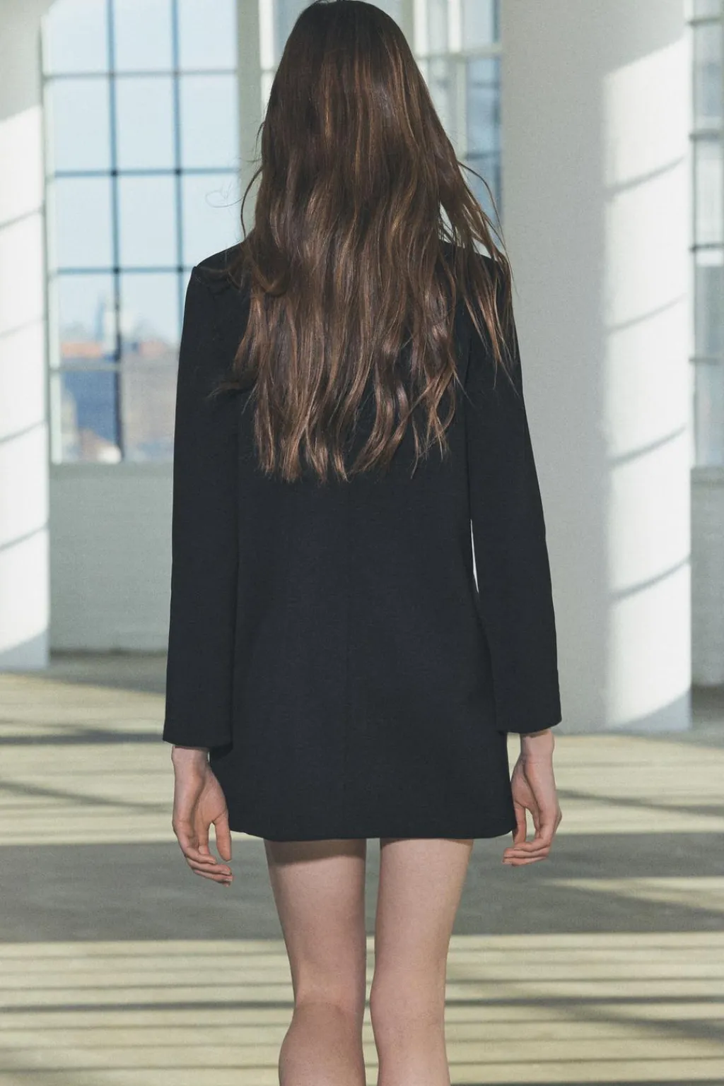 Vestido corto de cuello perkins y manga larga. Bolsillos delanteros con botones metálicos.