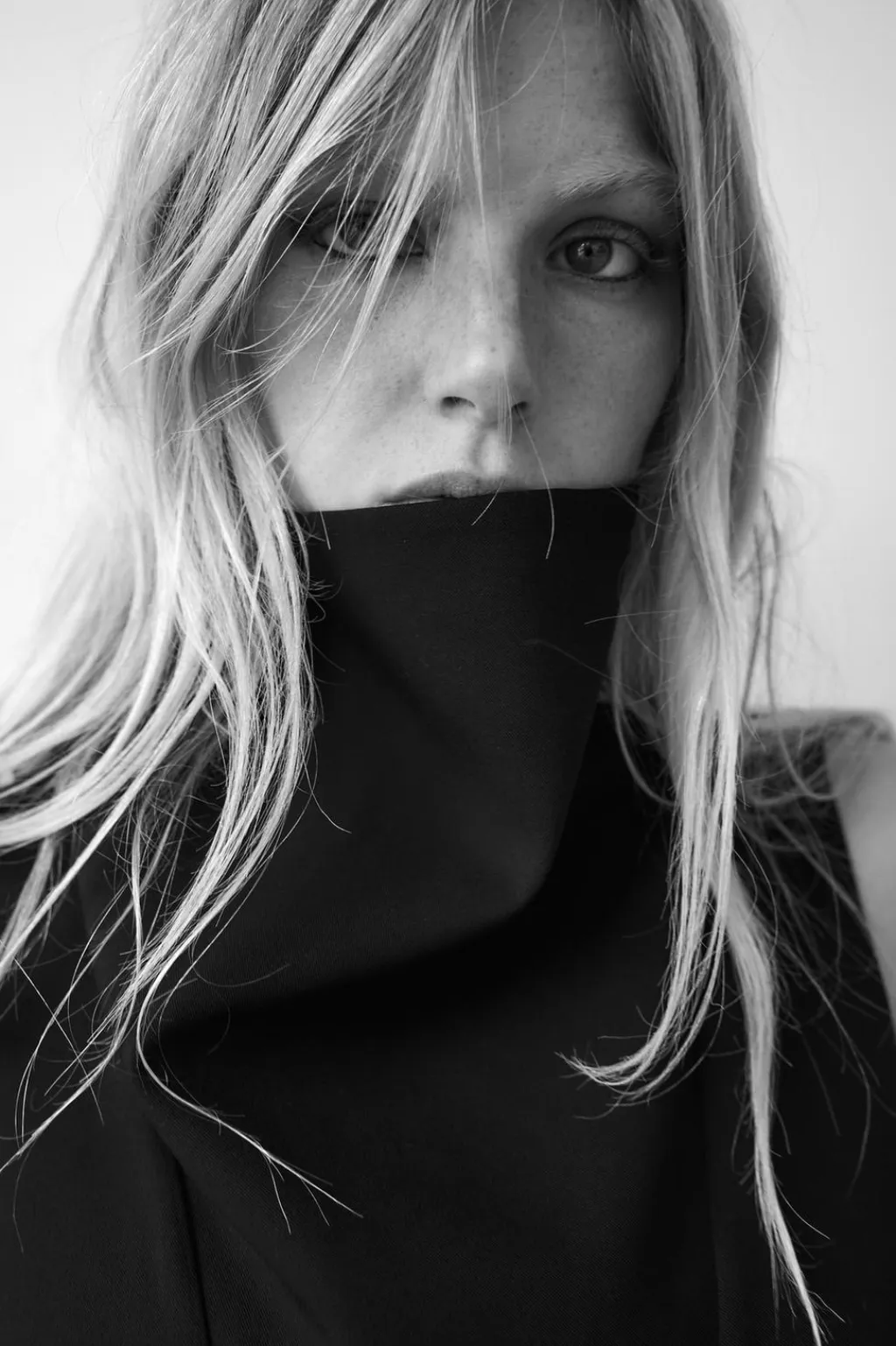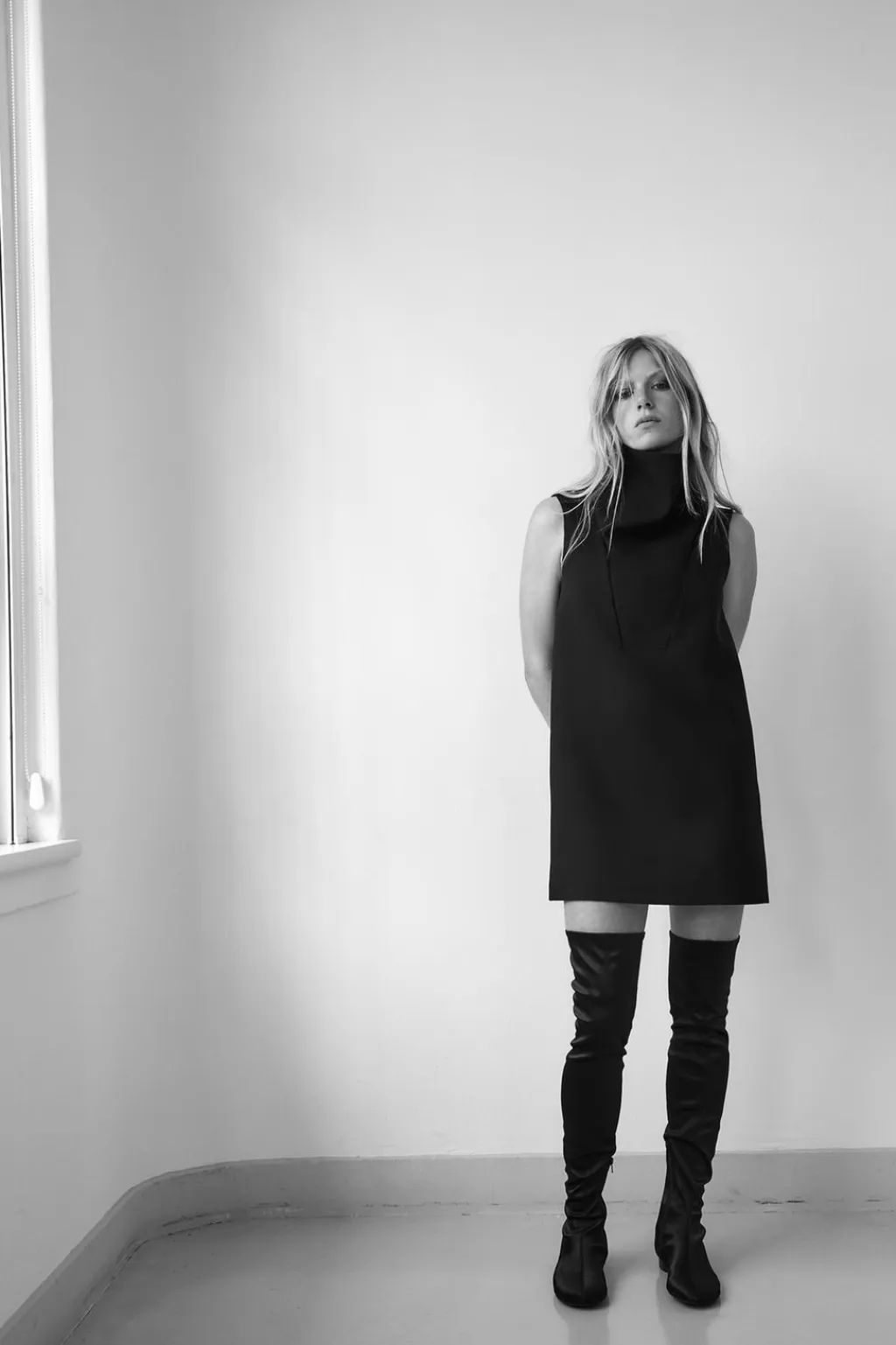 Vestido corto de cuello subido y manga sisa. Bolsillos laterales ocultos en costura. Forro interior combinado a tono.