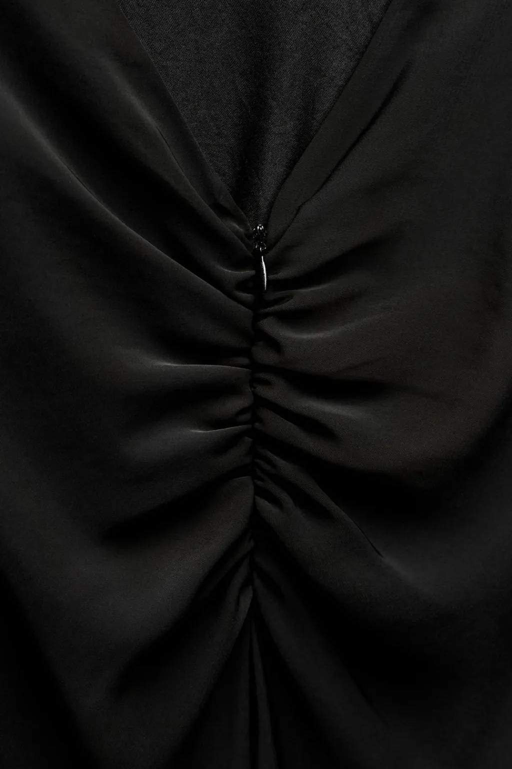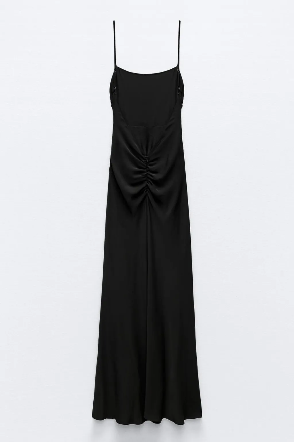 Vestido midi de escote recto y tirantes finos ajustables. Tejido drapeado en laterales. Espalda descubierta con tiras ajustables con lazada. Bajo con abertura en espalda. Cierre con cremallera oculta en costura.