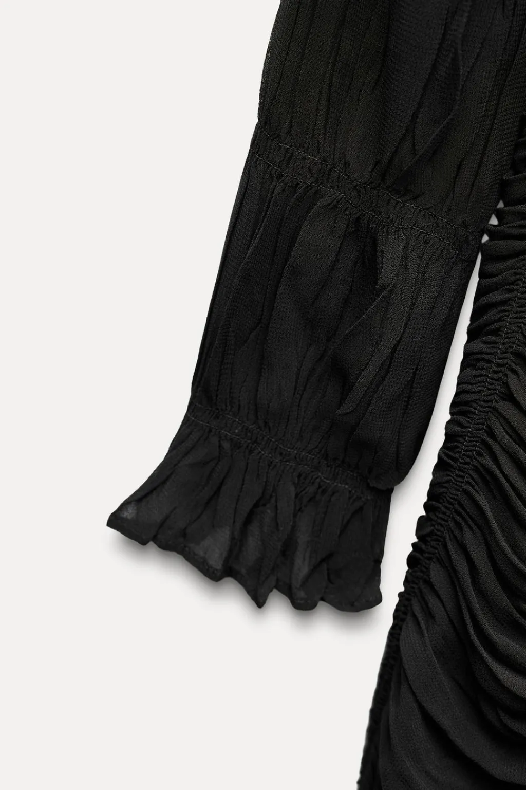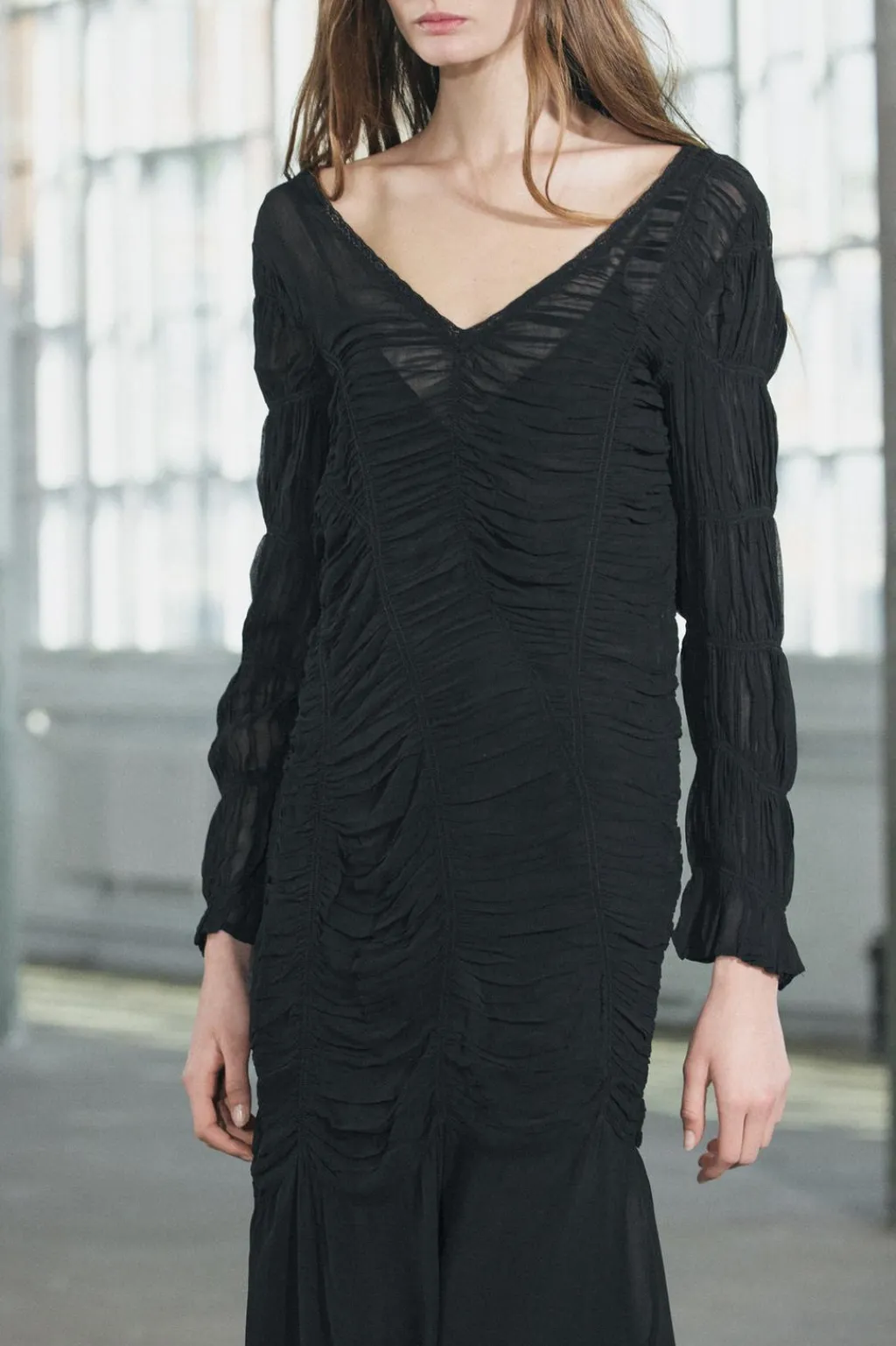 Vestido largo de escote pico y manga larga. Detalle de tejido drapeado con frunces. Forro interior.