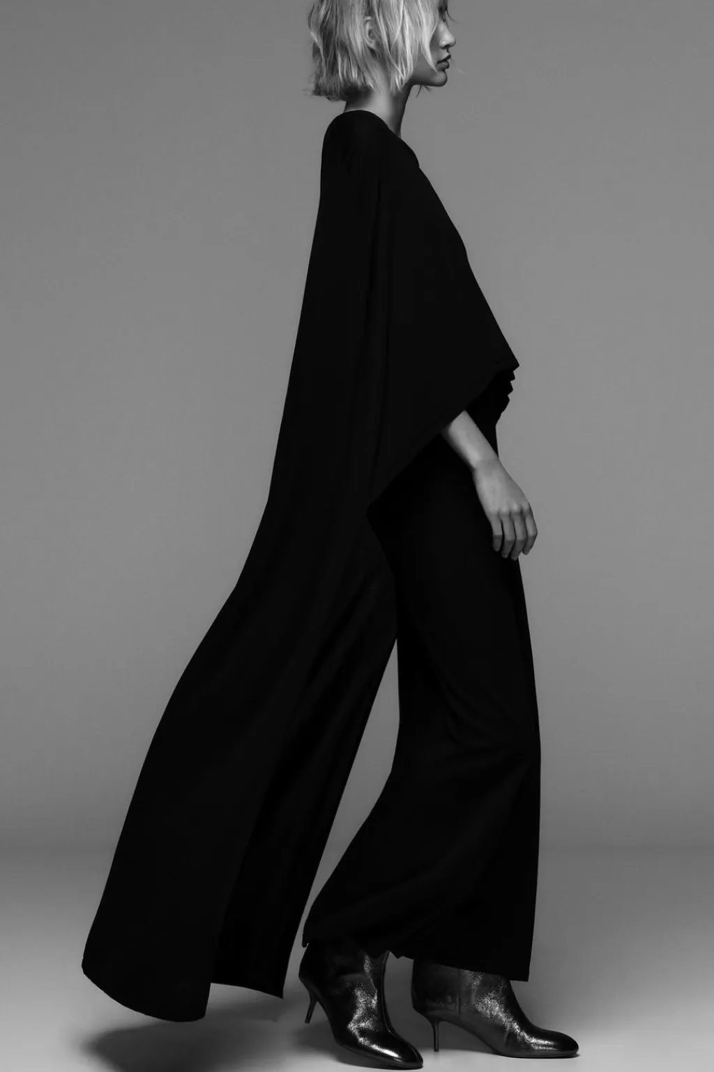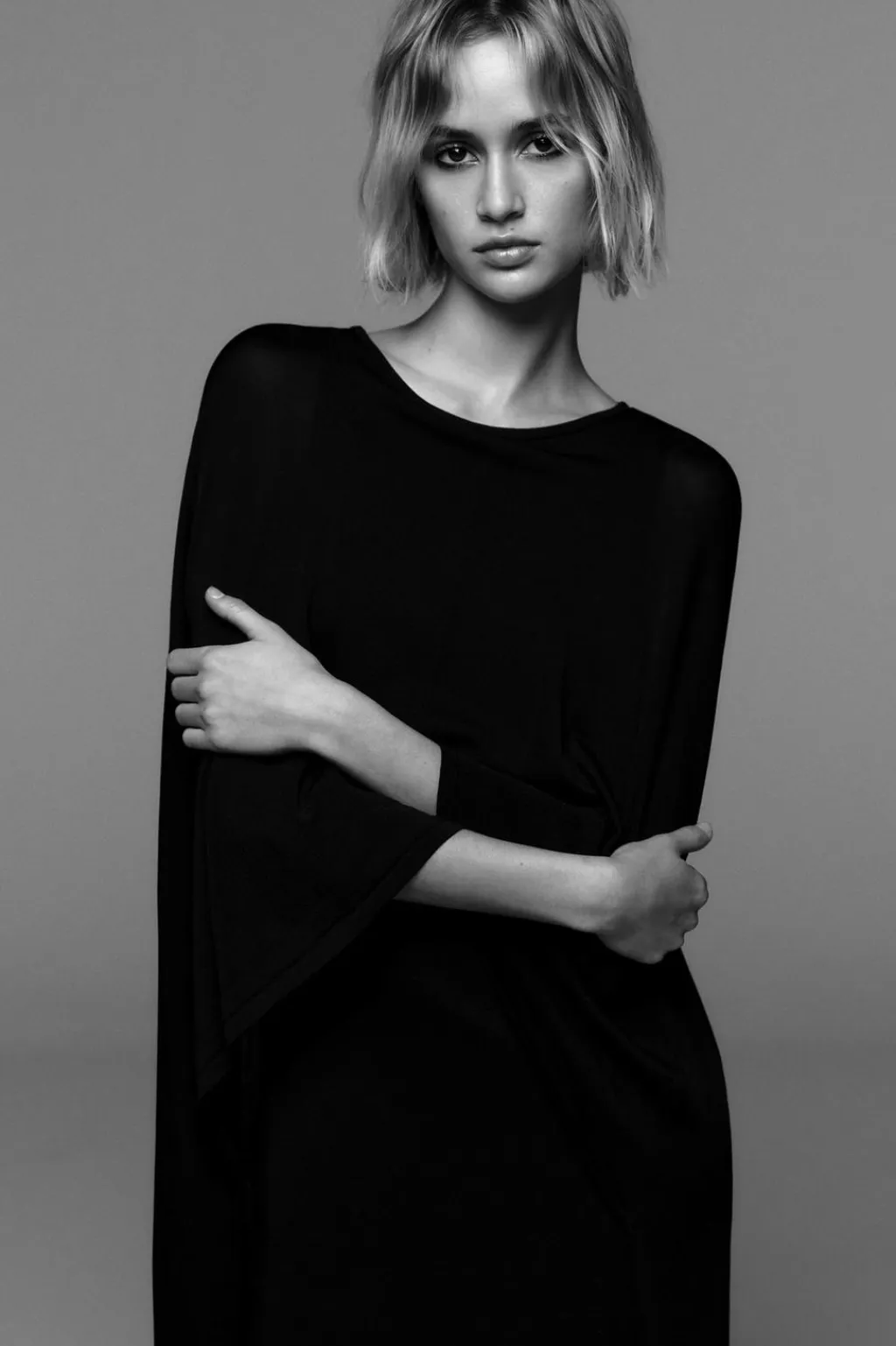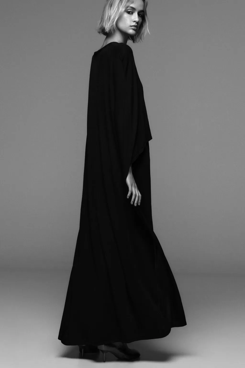 Vestido de cuello redondo y manga larga tipo capa.