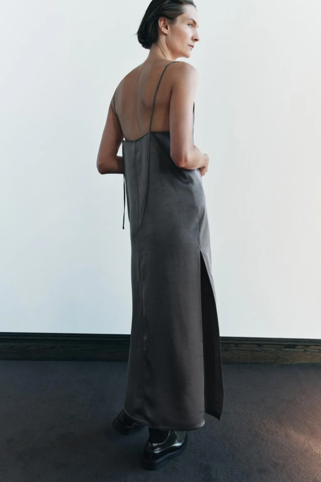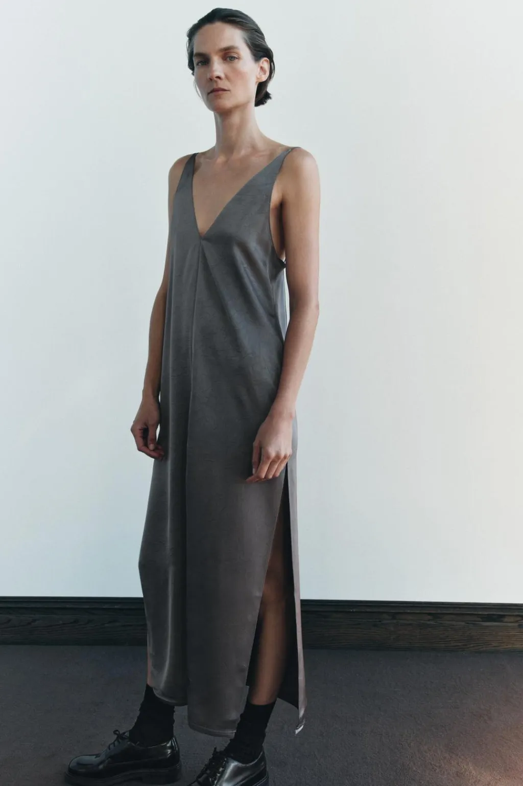 Vestido midi lencero de escote pico y tirantes finos. Detalle de tejido arrugado. Bajo con aberturas laterales.