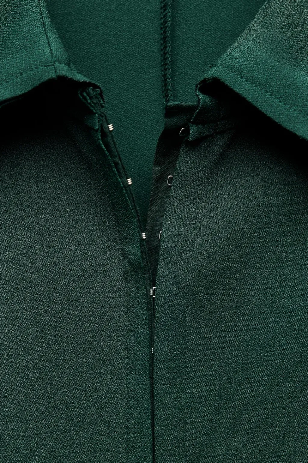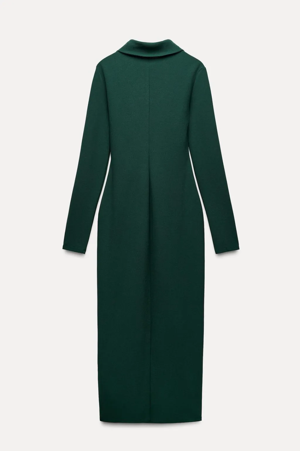 Vestido midi entallado de cuello solapa y manga larga. Bajo acabado en abertura. Cierre frontal con ganchos metálicos.