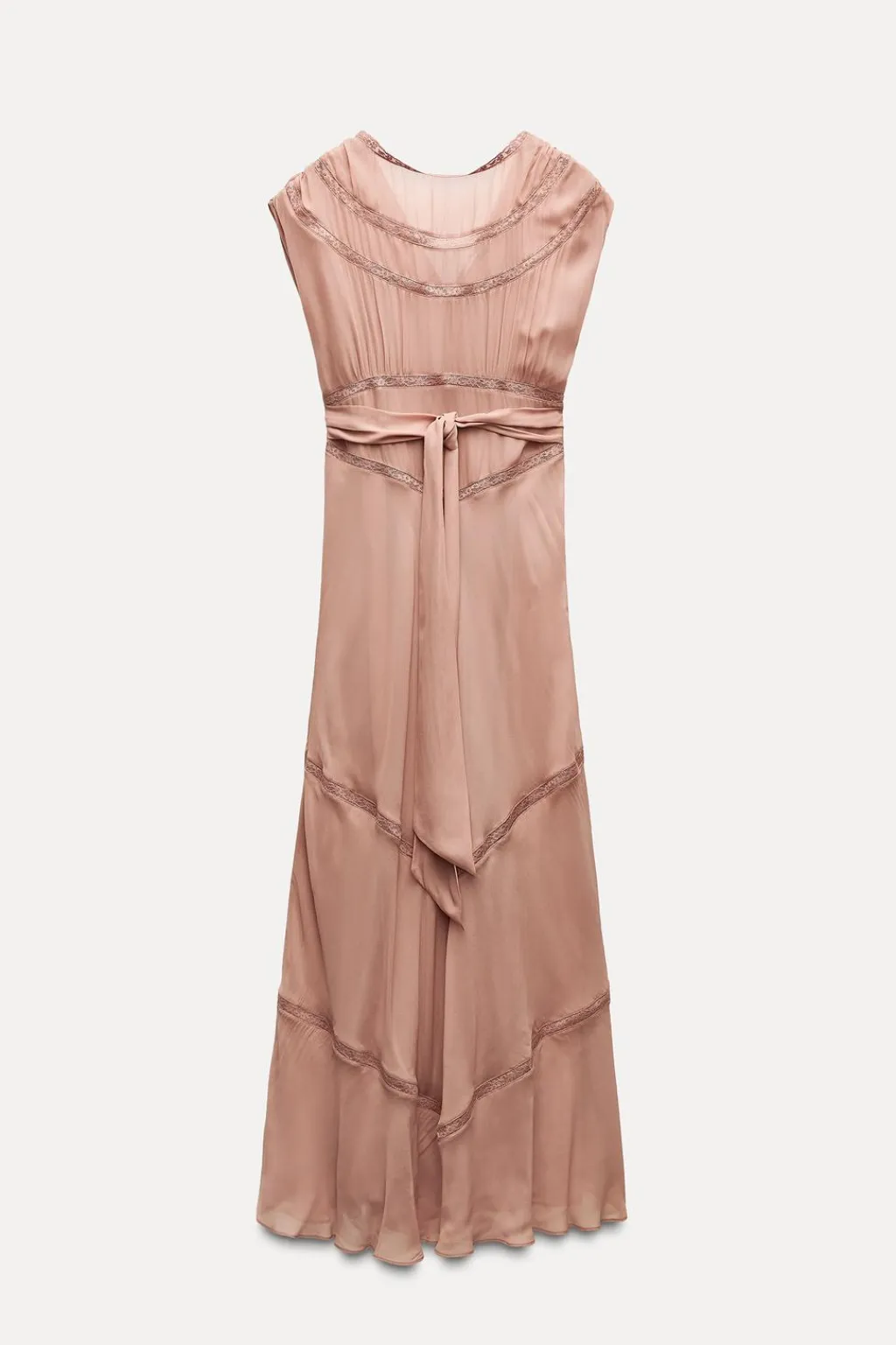 Vestido midi de cuello redondo y manga corta. Detalle de aplicación de encaje. Escote en espalda. Forro interior a tono.