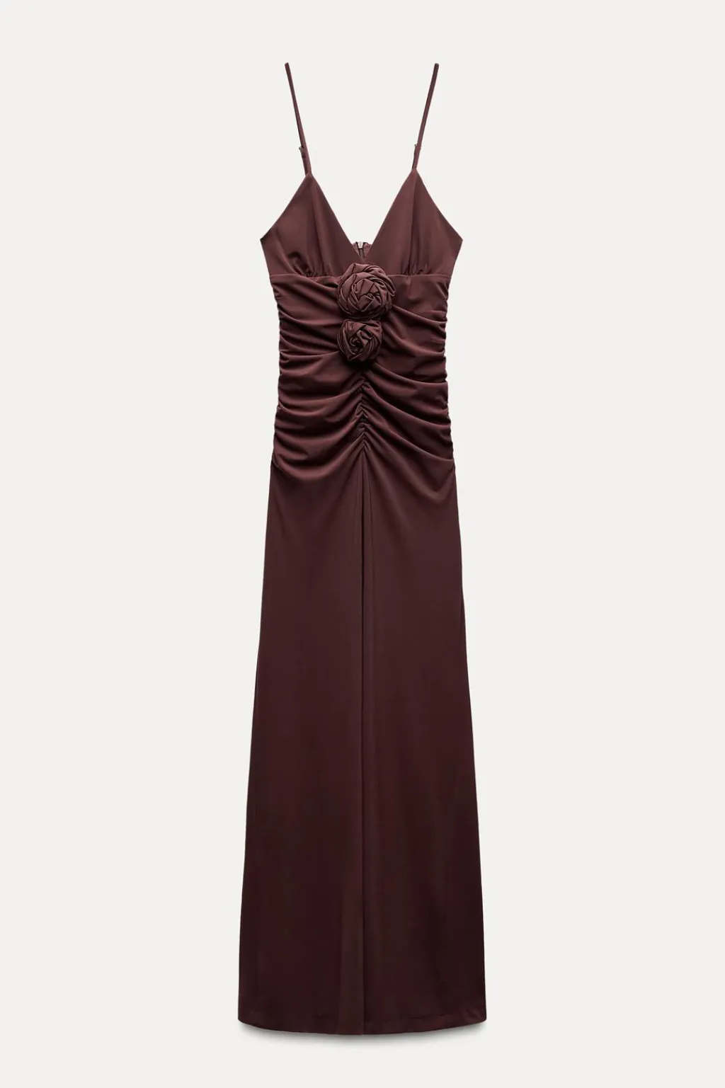 Vestido midi confeccionado en tejido tipo punto. Escote pico y tirantes finos ajustables. Tejido drapeado. Detalle de flores en relieve en delantero. Forro interior. Cierre en espalda con cremallera oculta en costura.