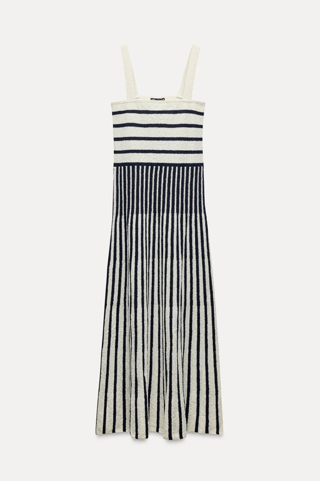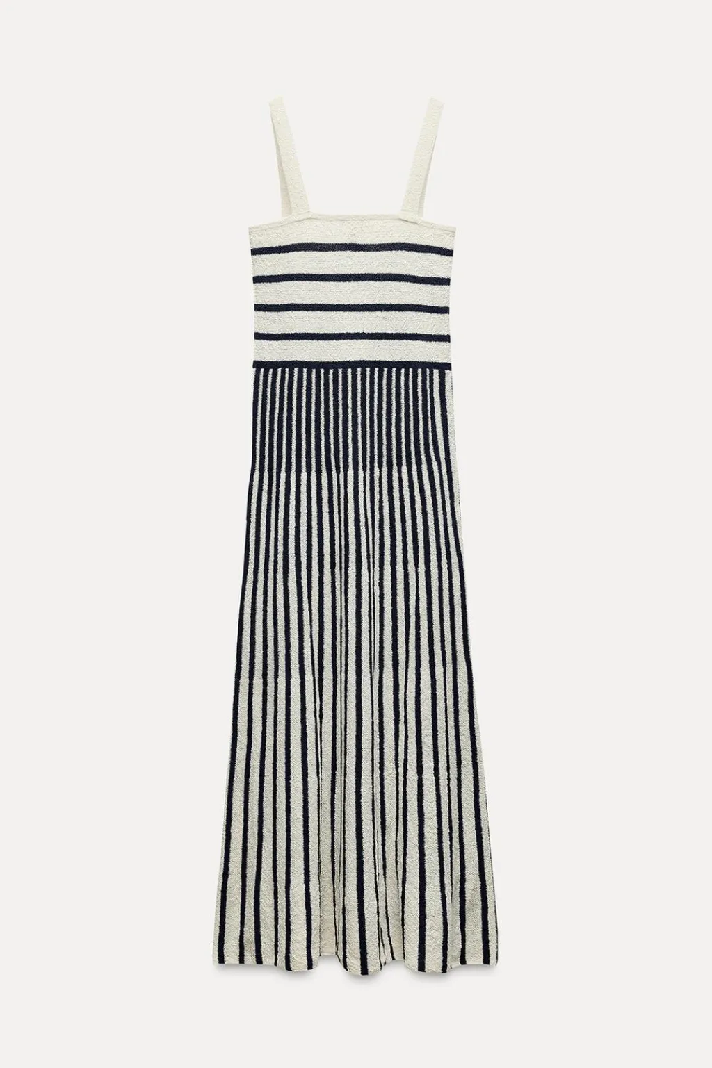 Vestido midi confeccionado en tejido tipo punto. Escote recto y tirantes anchos.