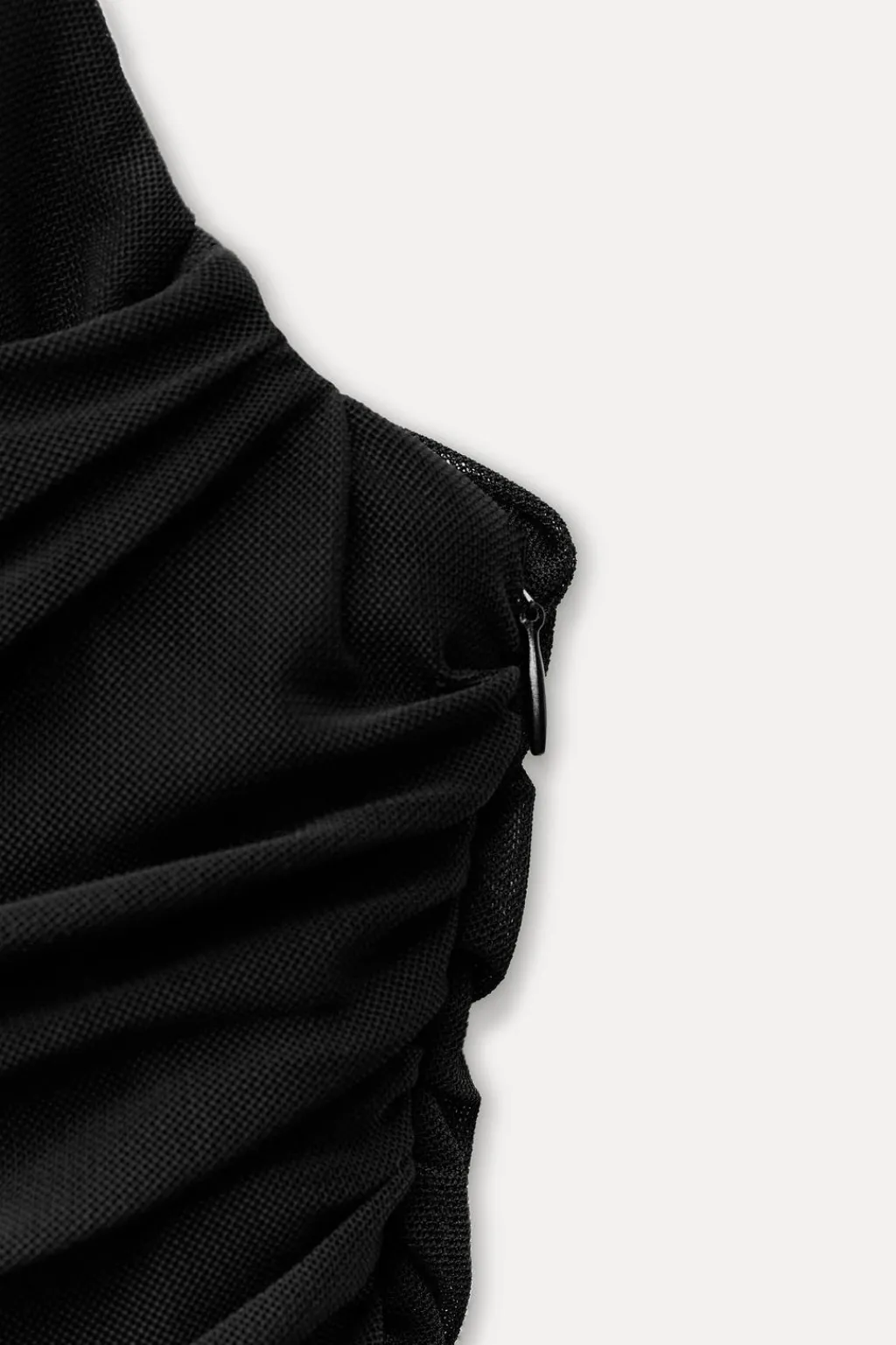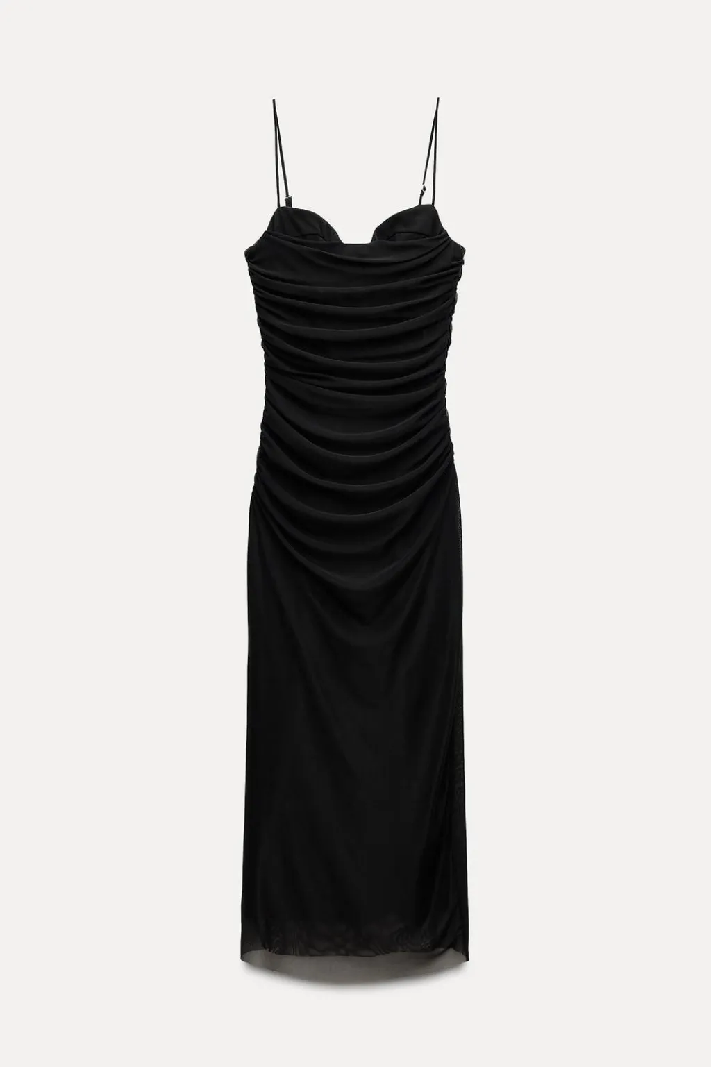 Vestido midi con aros y escote corazón. Tirantes finos ajustables. Tejido drapeado. Cierre con cremallera oculta en costura.