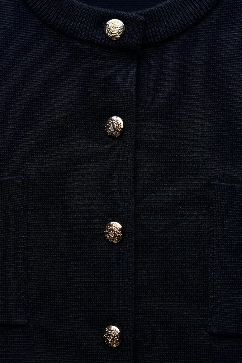 Vestido de cuello redondo y manga corta. Bolsillos delanteros de plastrón. Cintura entallada. Cierre frontal con botones dorados con relieve.