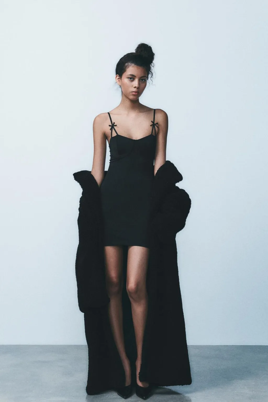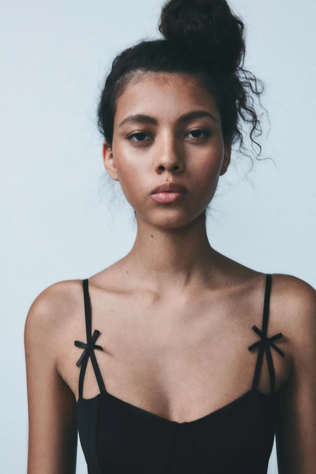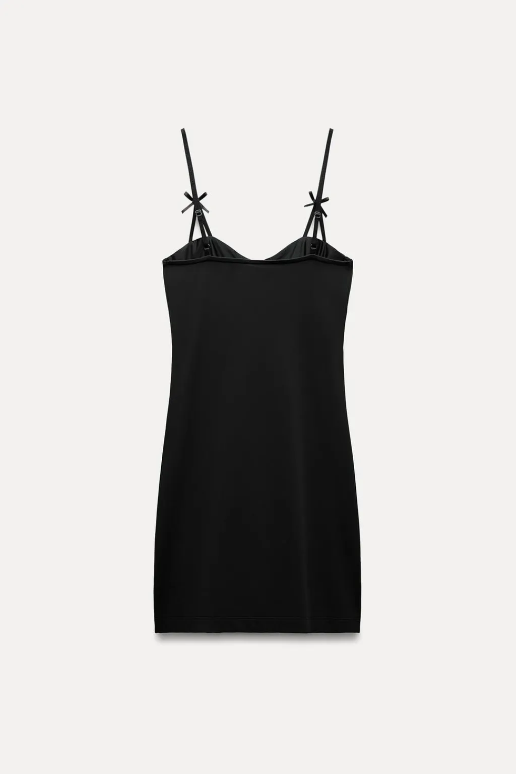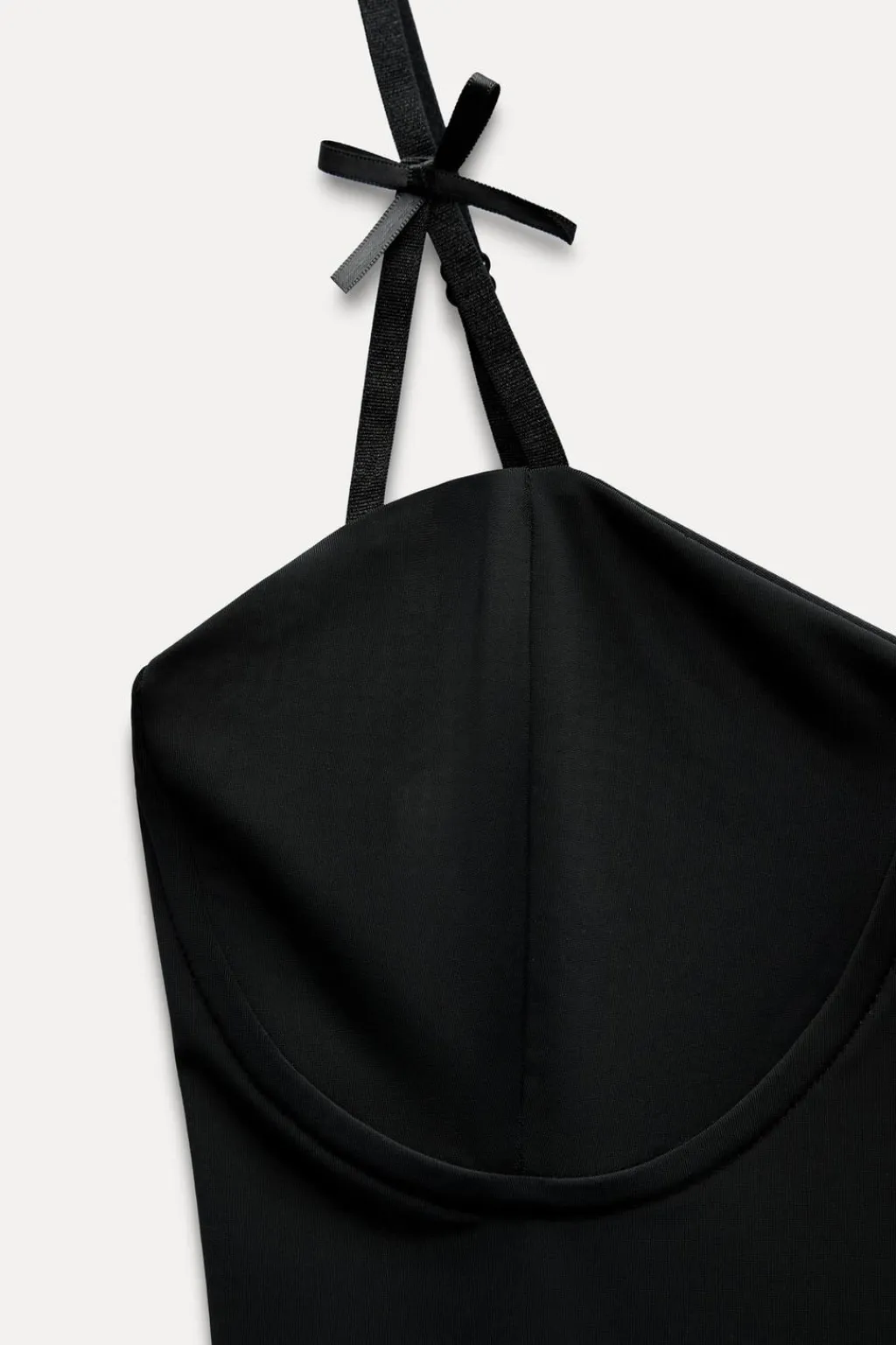 Vestido corto entallado confeccionado con poliamida. Escote redondo y tirantes finos elásticos ajustables con detalle de lazo a tono.