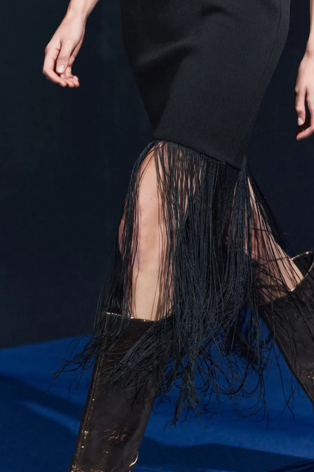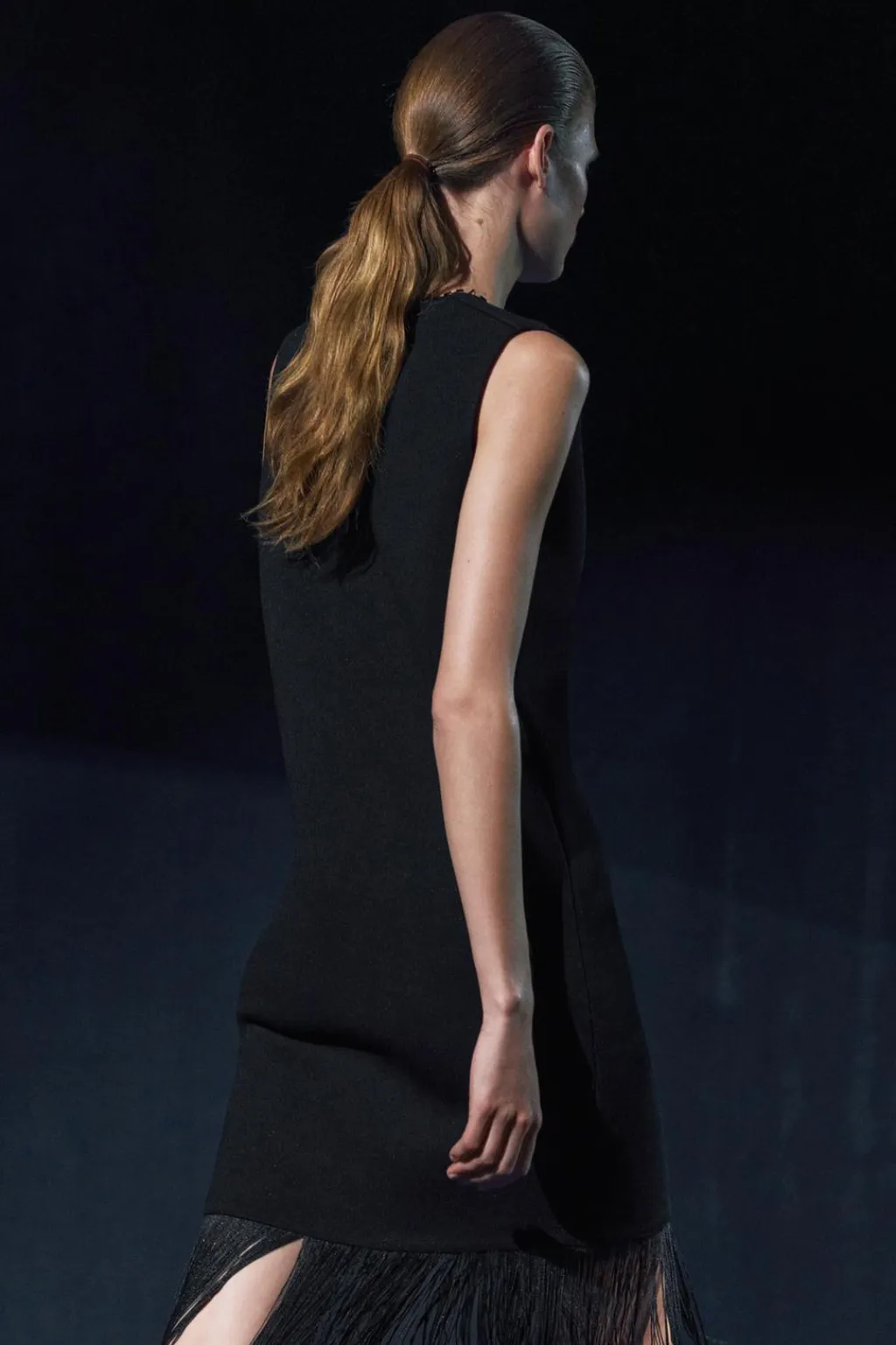 Vestido de escote pronunciado con tiras finas y manga sisa. Bajo acabado con flecos.
