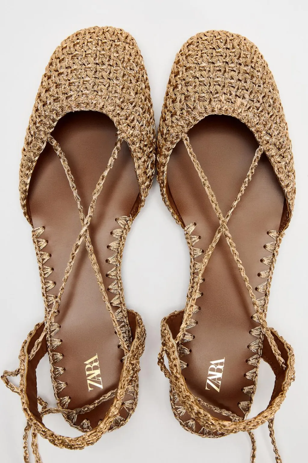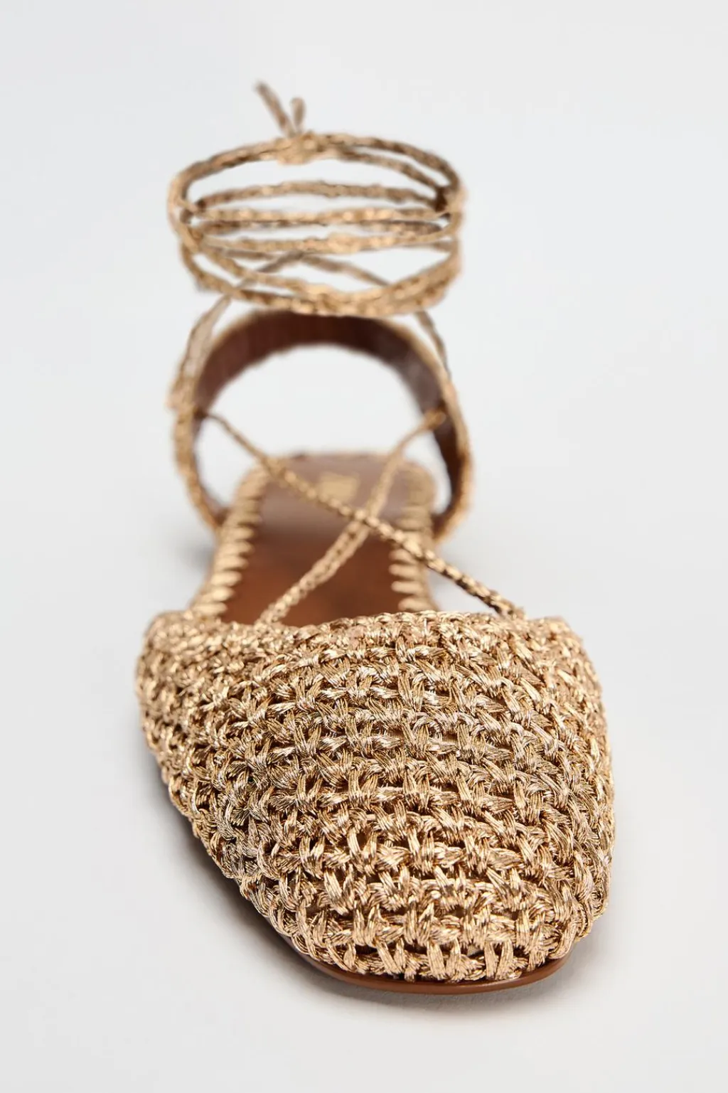 Zapato plano destalonado en crochet. Detalle de tejido con hilo efecto metalizado. Cierre mediante tiras atadas al tobillo