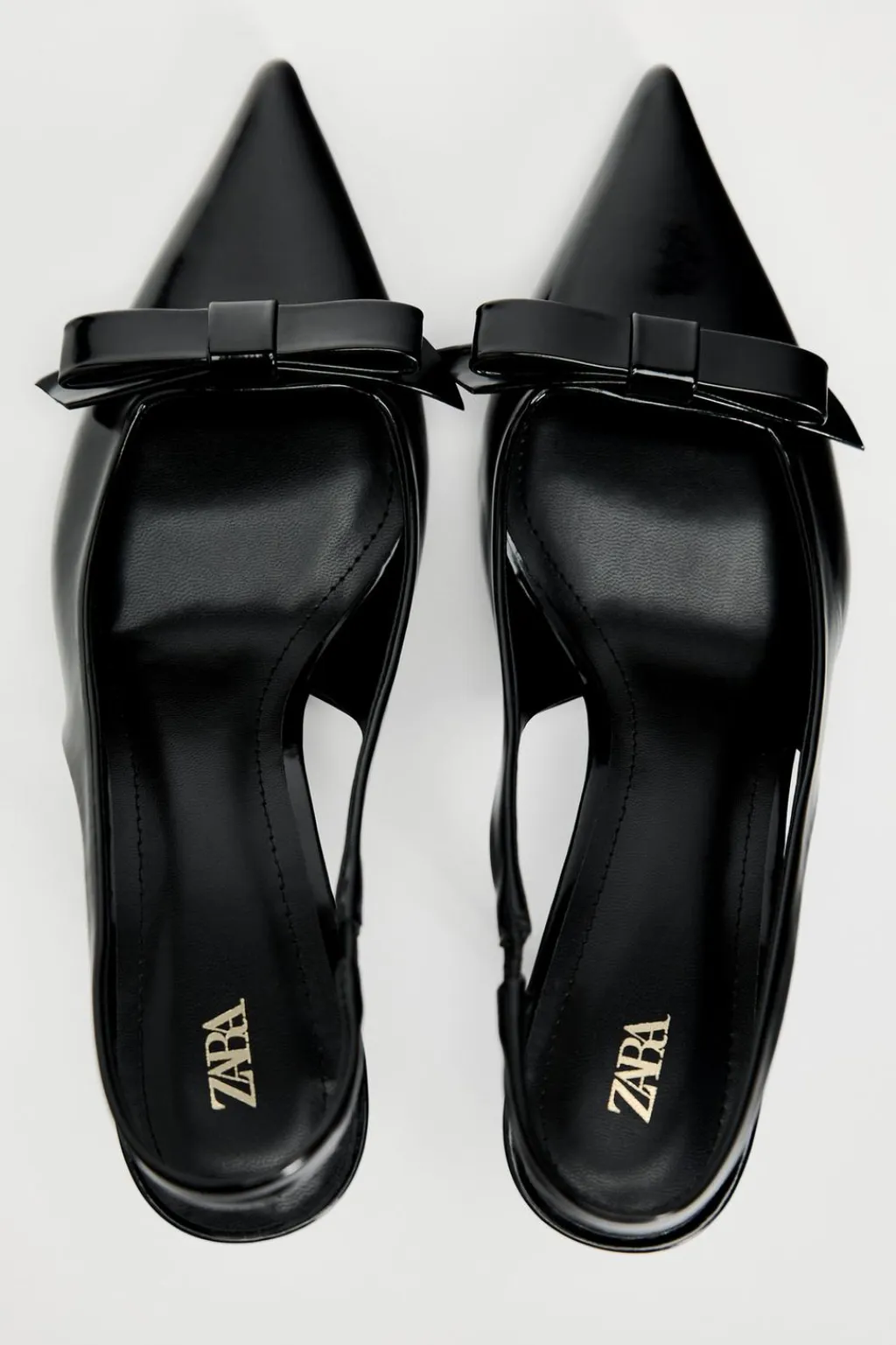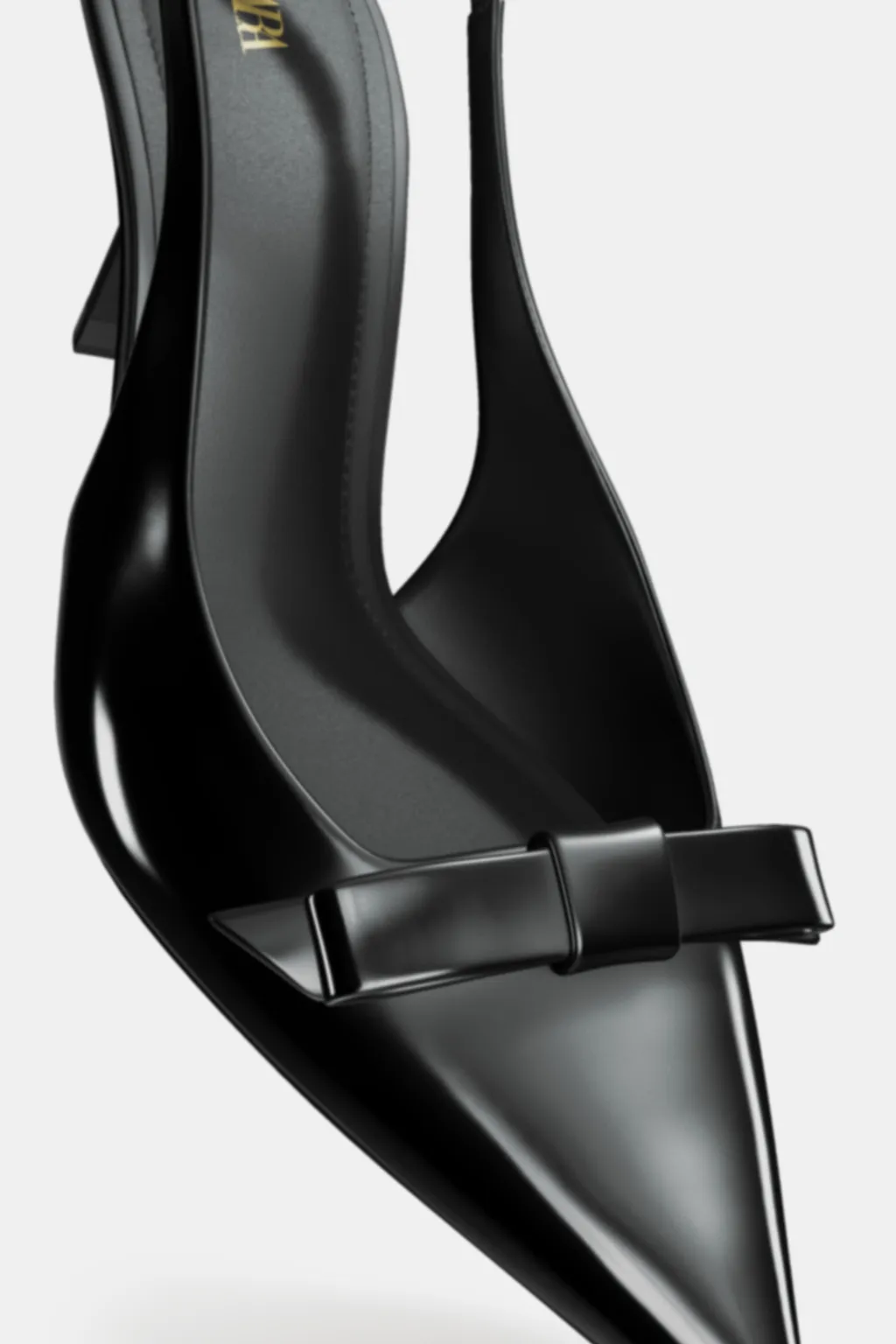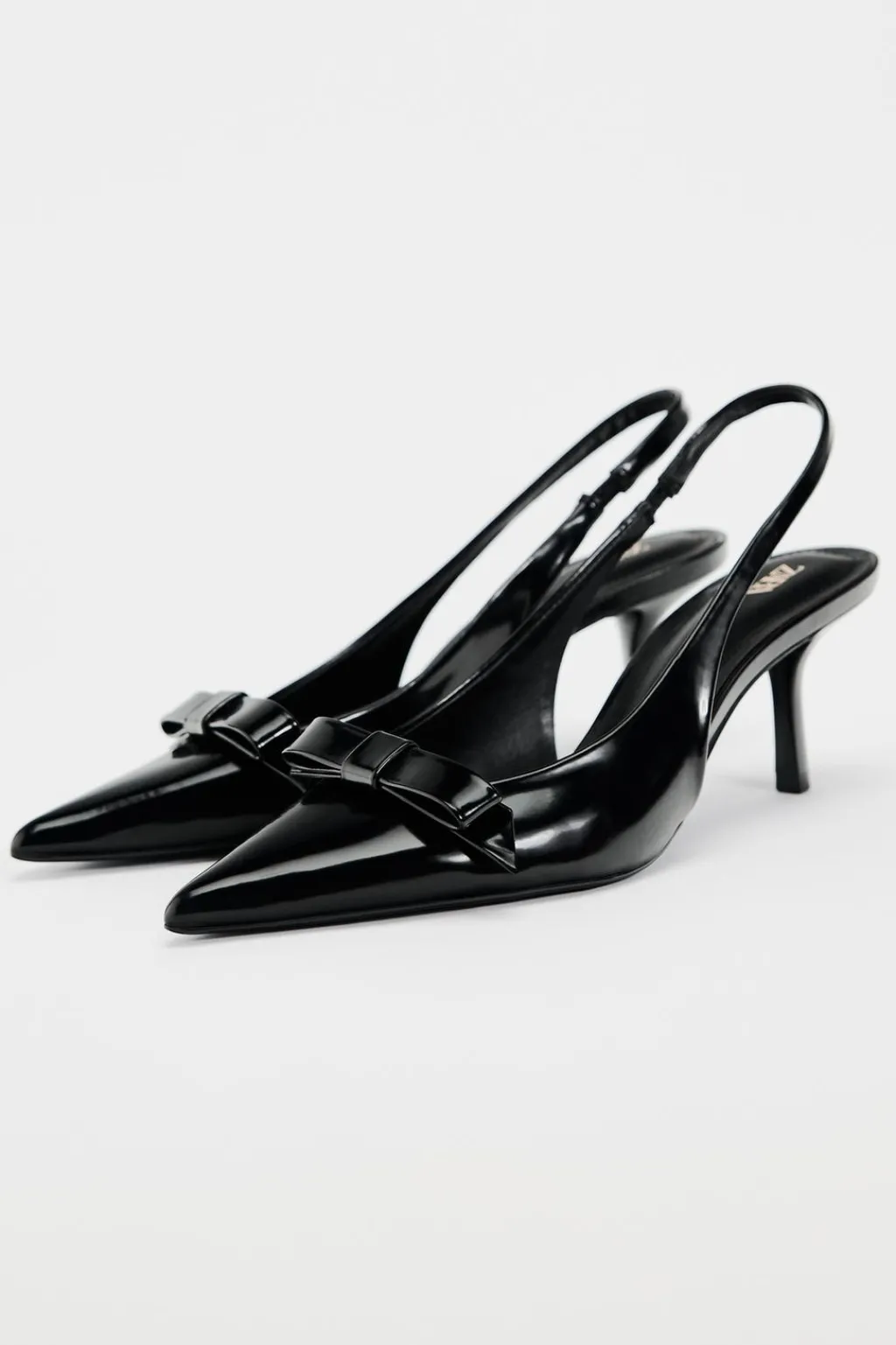 Zapato destalonado de tacón con efecto acharolado. Detalle de lazo en la parte delantera. Acabado en punta. Tira trasera con elástico.