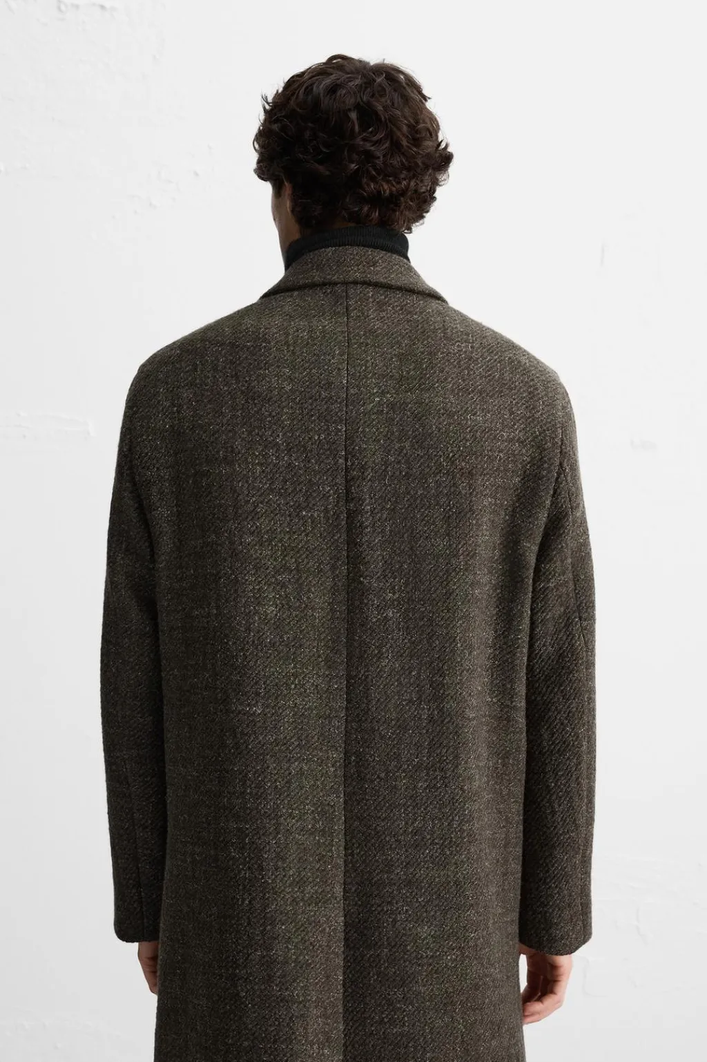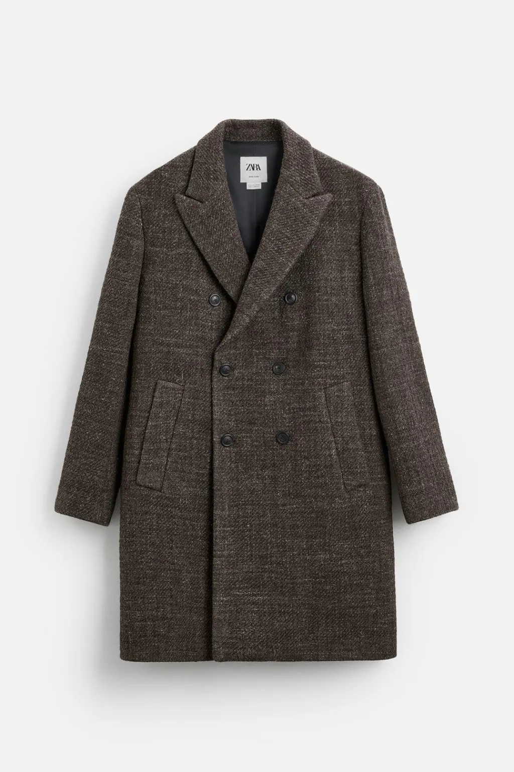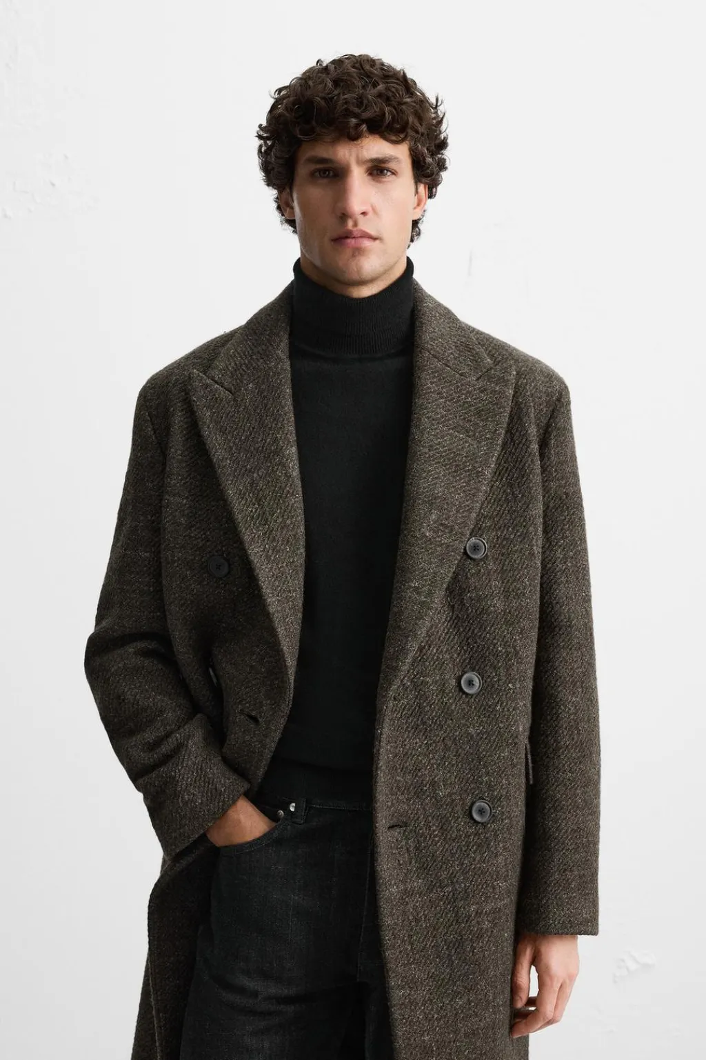 Abrigo regular fit confeccionado en tejido con mezcla de lana. Cuello con solapas de pico y manga larga. Bolsillos de vivo en cadera y detalle de bolsillo interior. Bajo con abertura en centro espalda. Cierre frontal de botonadura cruzada.