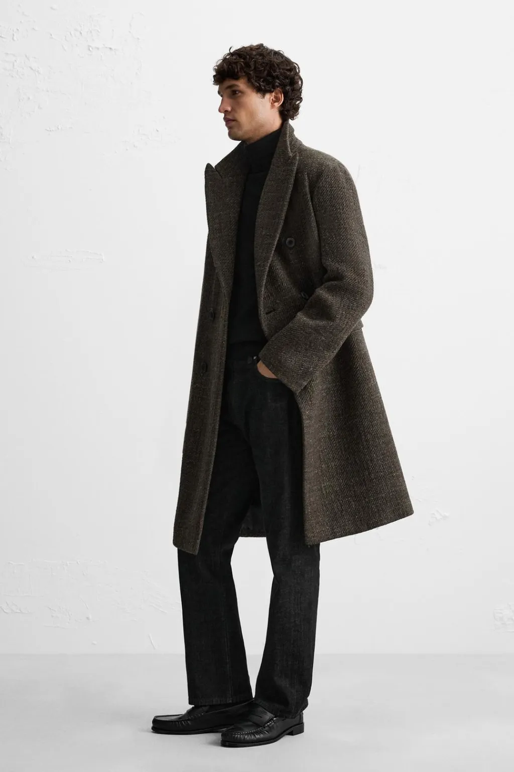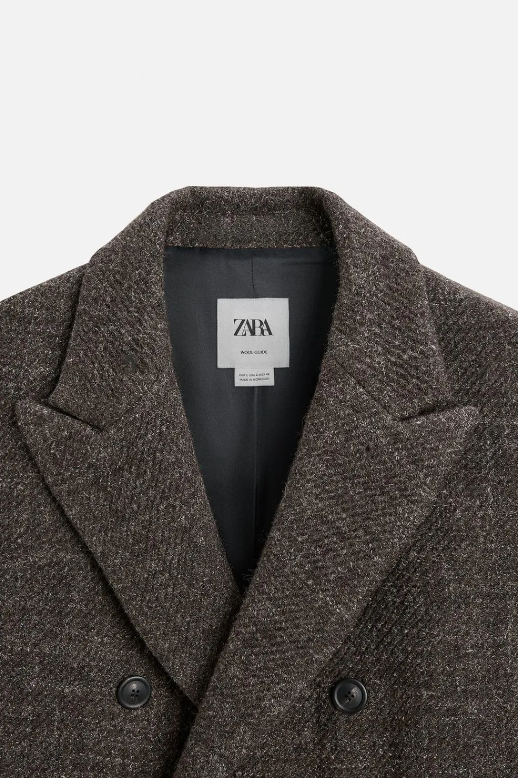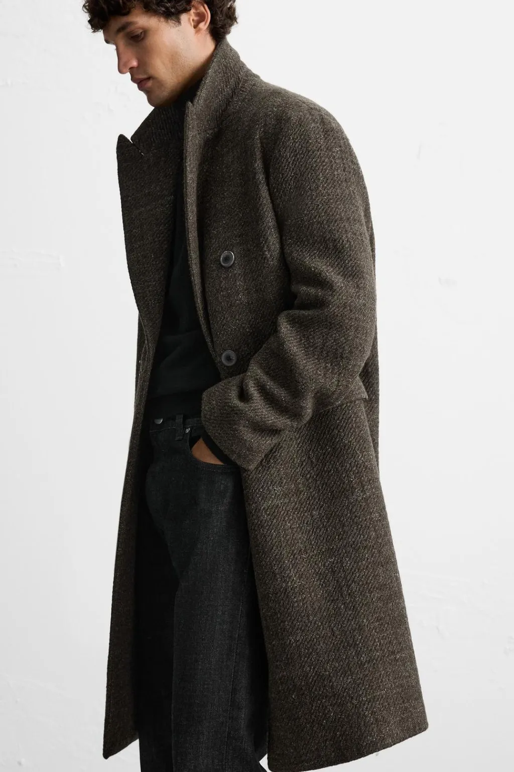 Abrigo regular fit confeccionado en tejido con mezcla de lana. Cuello con solapas de pico y manga larga. Bolsillos de vivo en cadera y detalle de bolsillo interior. Bajo con abertura en centro espalda. Cierre frontal de botonadura cruzada.
