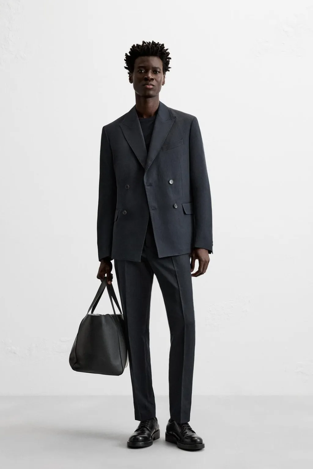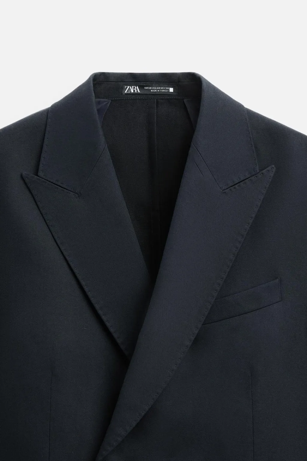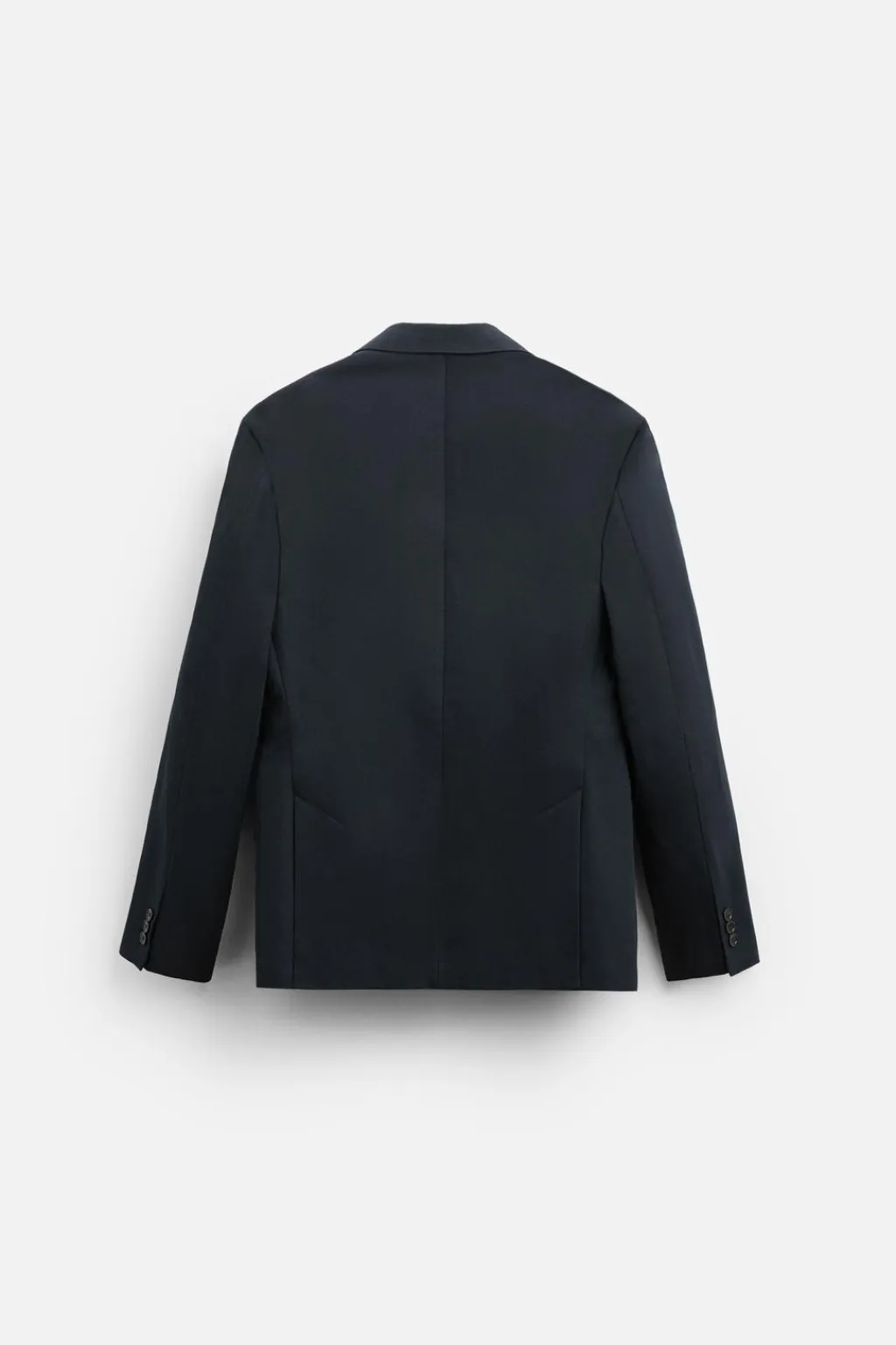 Blazer regular fit confeccionada en tejido con mezcla de lino y algodón. Cuello con solapas de pico. Manga larga acabada en puño con detalle de botones. Bolsillo de vivo en pecho y de solapa en cadera. Detalle bolsillo interior. Bajo con aberturas en espalda. Cierre frontal de botonadura cruzada.