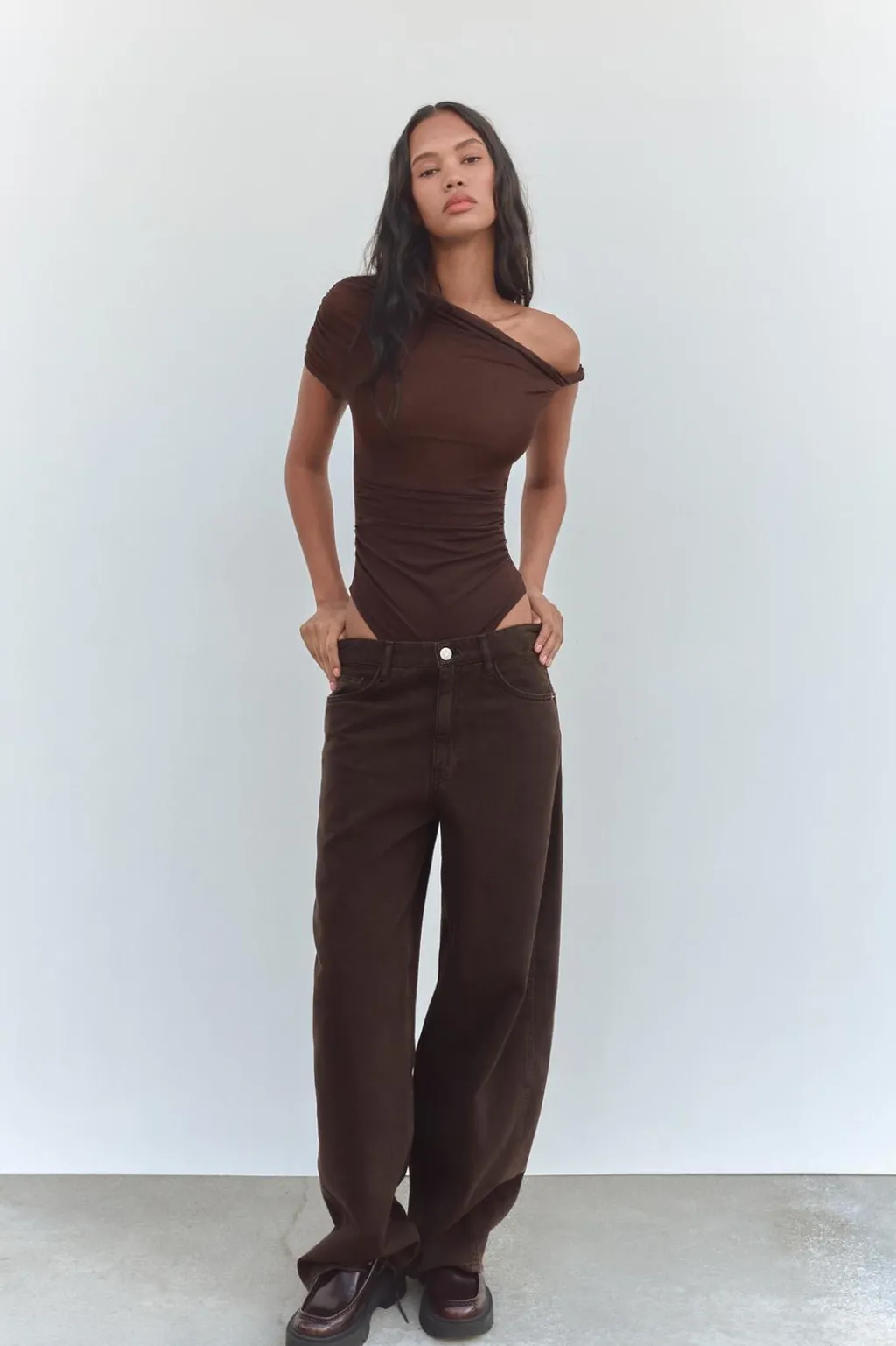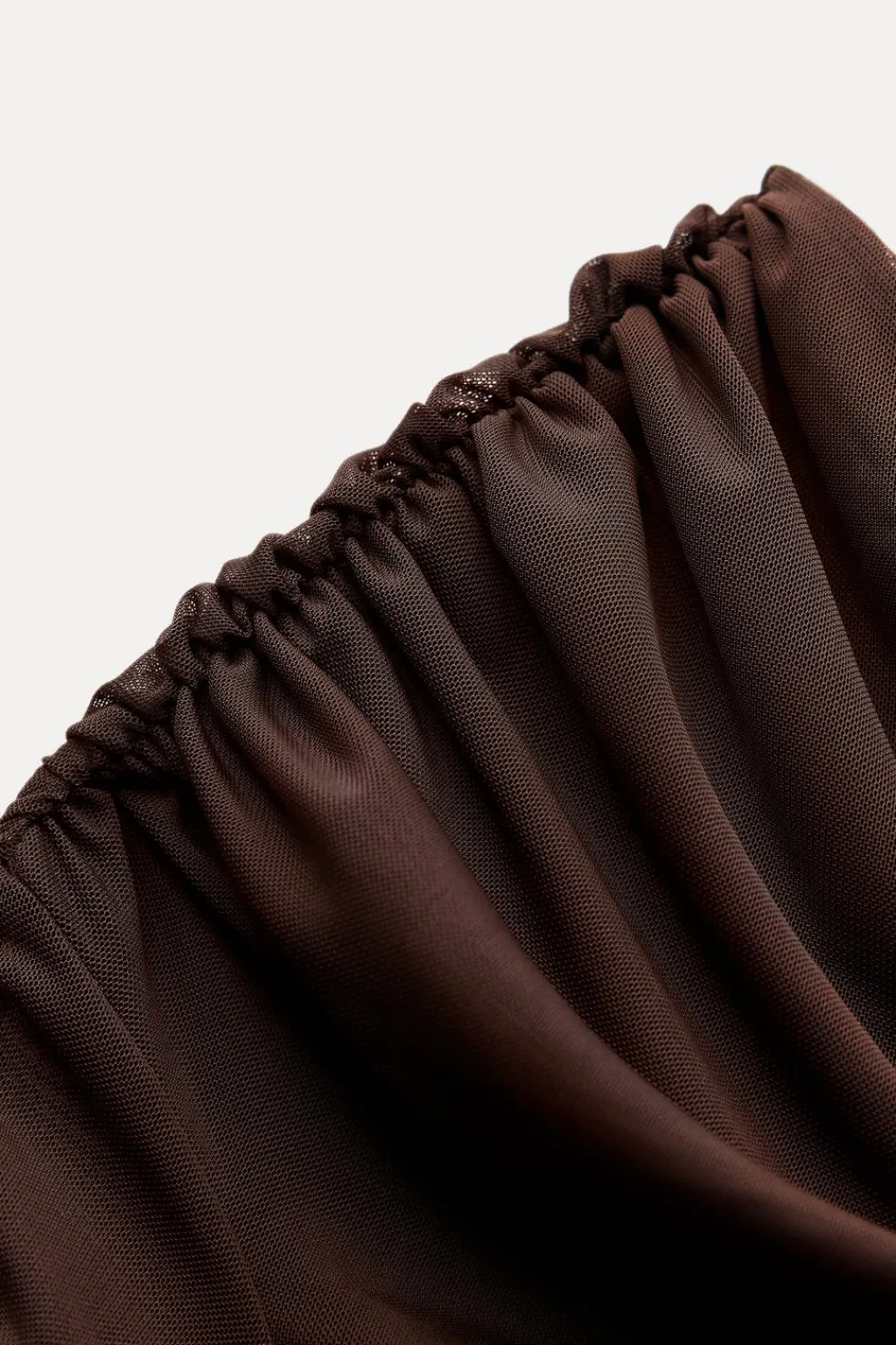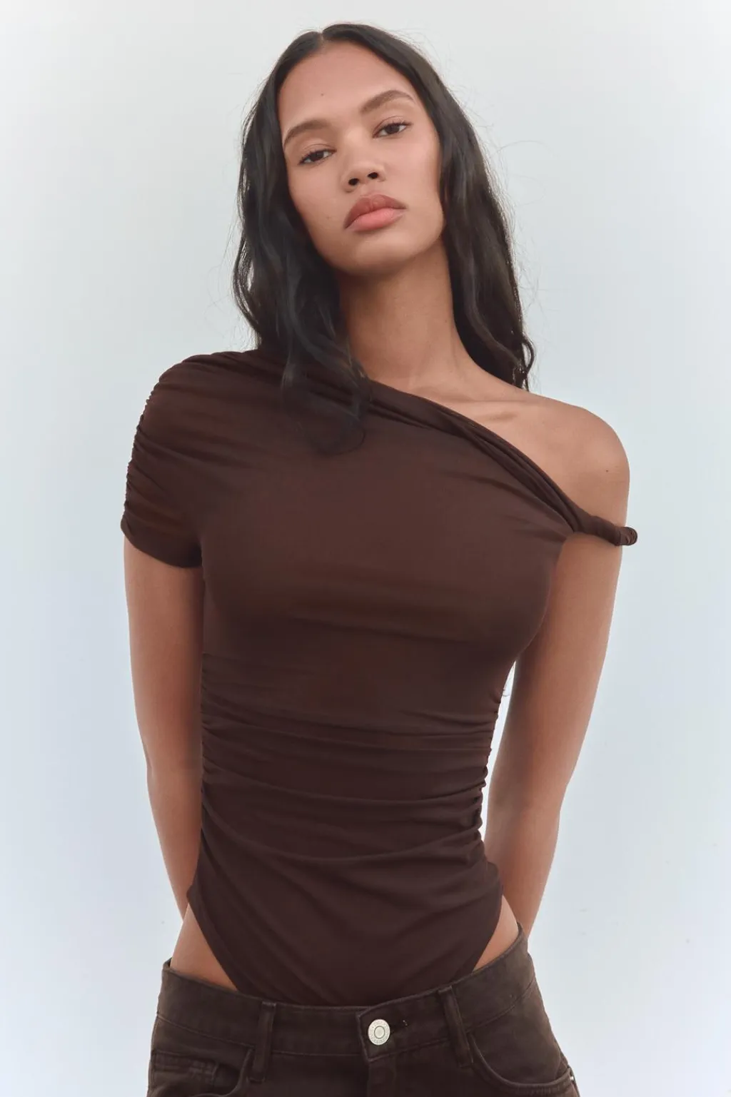 Body de escote asimétrico confeccionado en tejido tipo tul. Detalle de pliegues. Cierre en bajo con botones a presión.