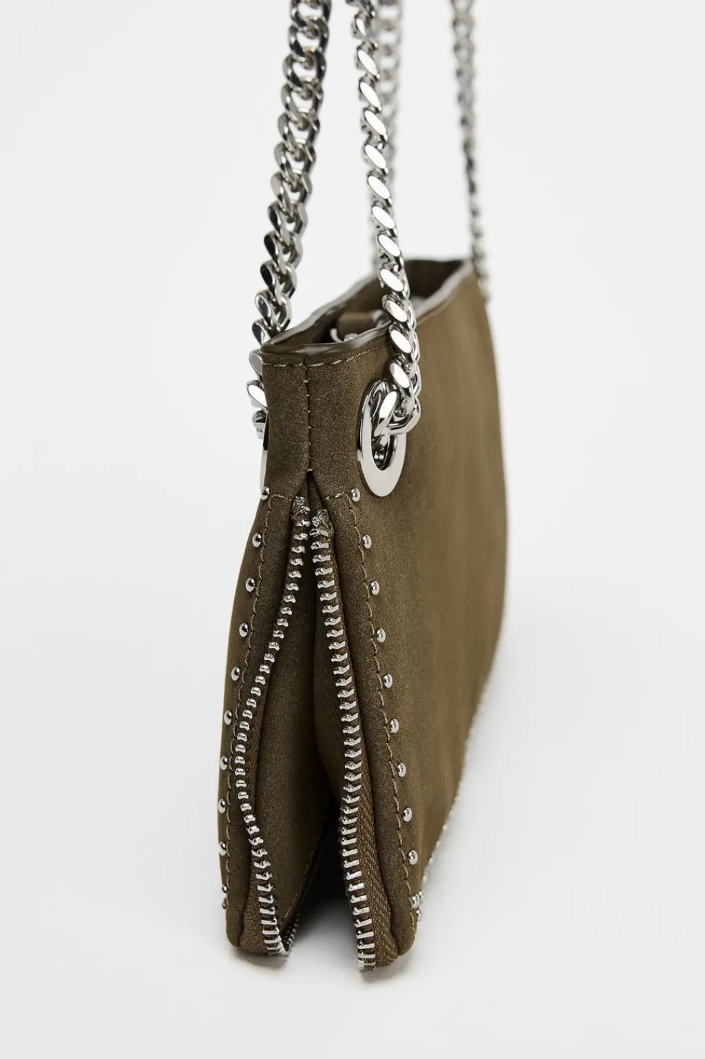 Bolso alargado con de tachas y detalle de cremallera en el corte. Bolsillo interior con cremallera. Asa multiposición de hombro y bandolera. Cierre mediante cremallera.