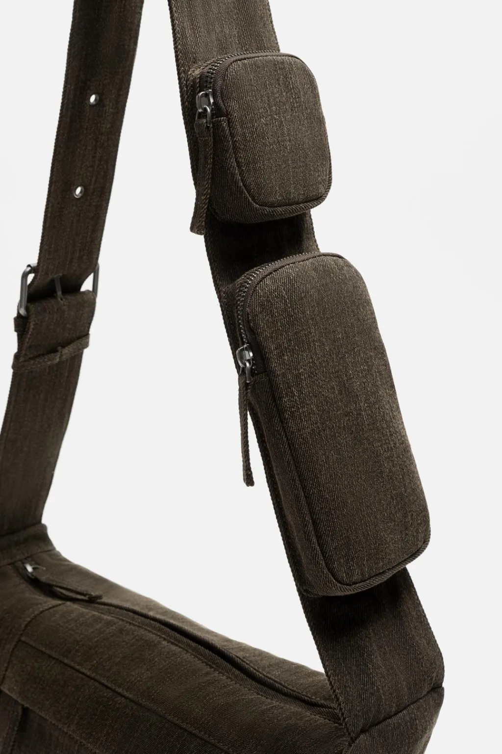 Bolso de hombro fabricado en tejido. Compartimento principal con cierre de cremallera y en su interior cuenta con un bolsillo pequeño con cierre con cremallera. En la parte frontal cuenta con un compartimento con cierre mediante cremallera. Asa de hombro ajustable con detalle de dos bolsillos pequeños con cierre mediante cremallera.