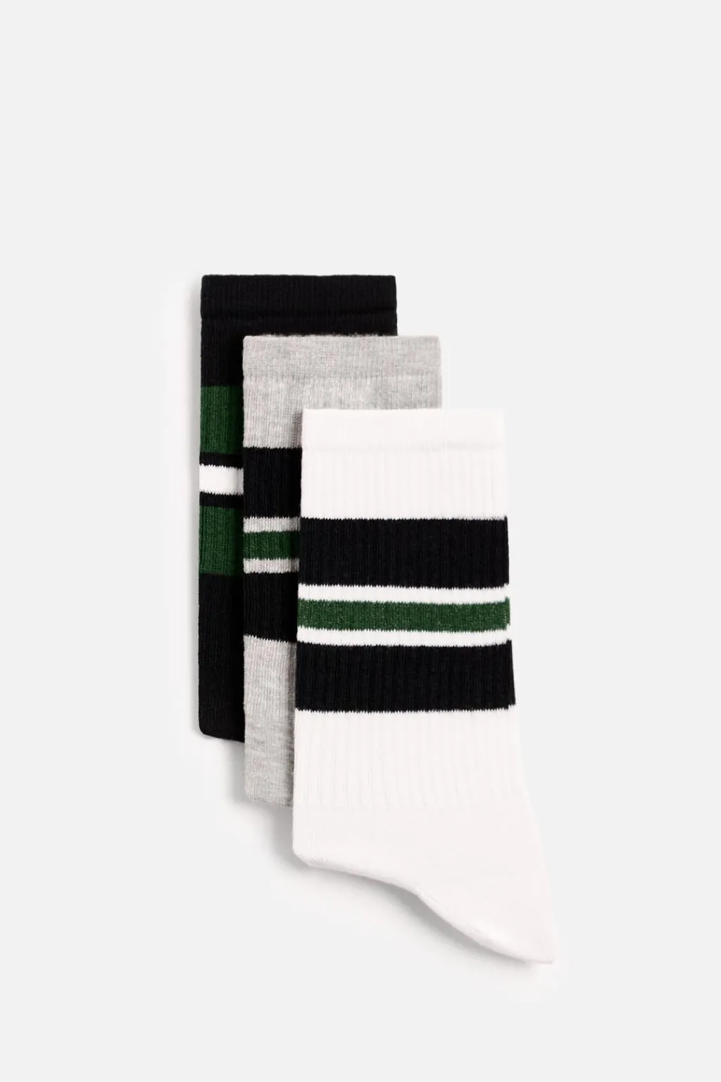 Pack de tres pares de calcetines tejidos en hilatura con mezcla de algodón. Acabados en rib elástico.