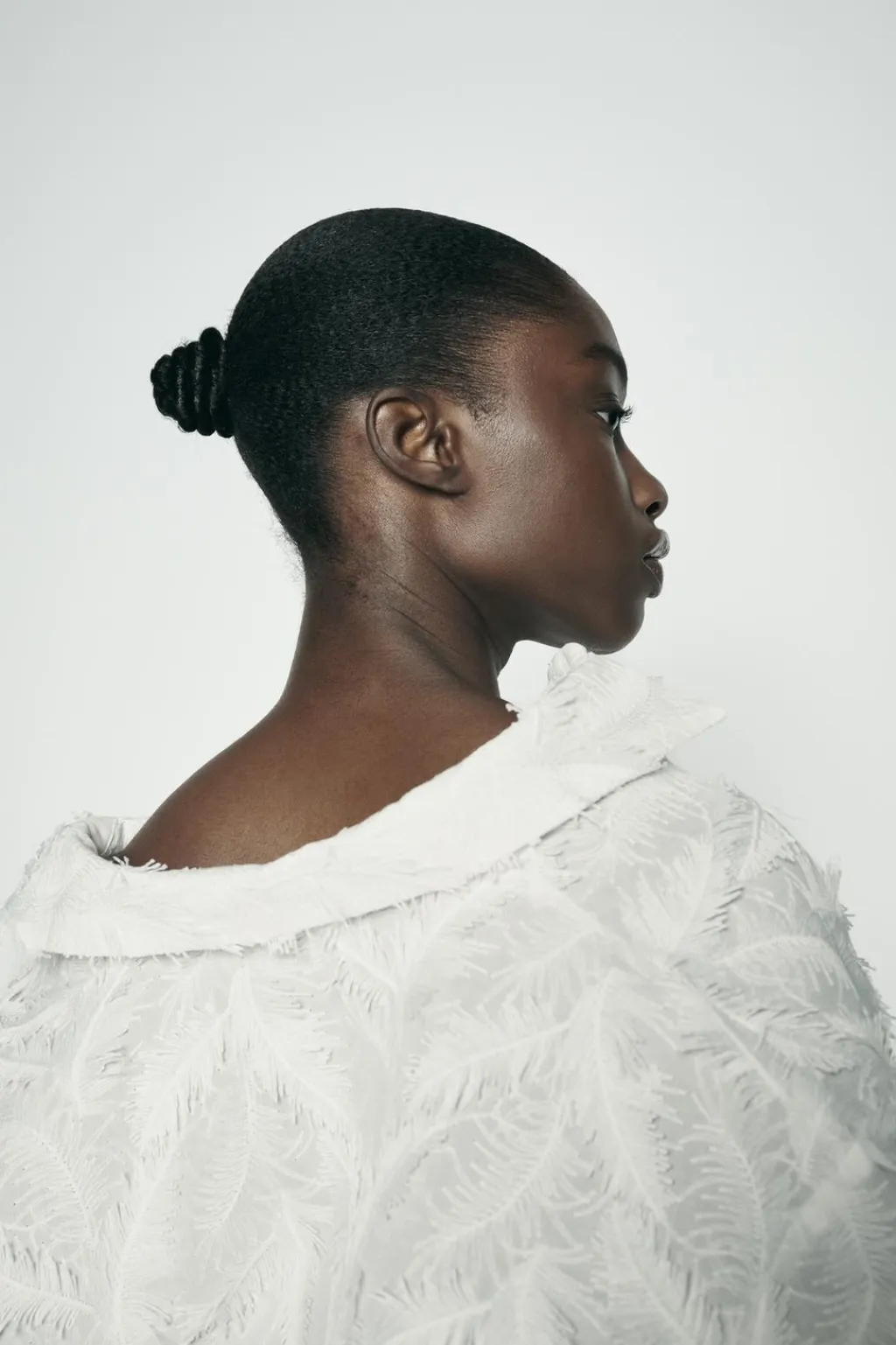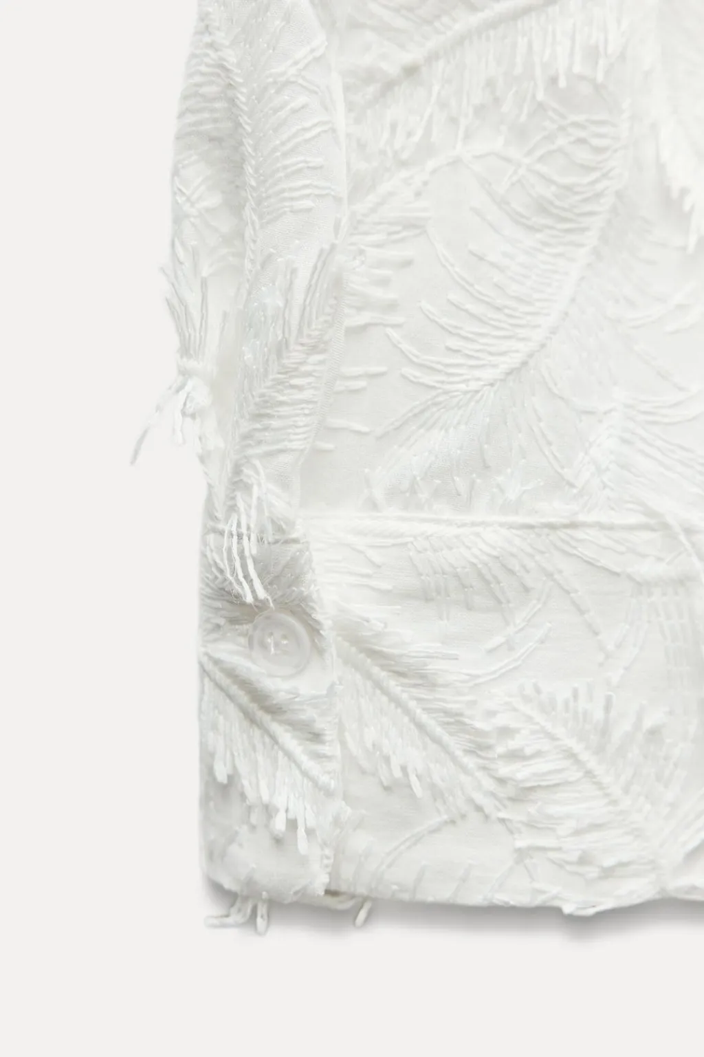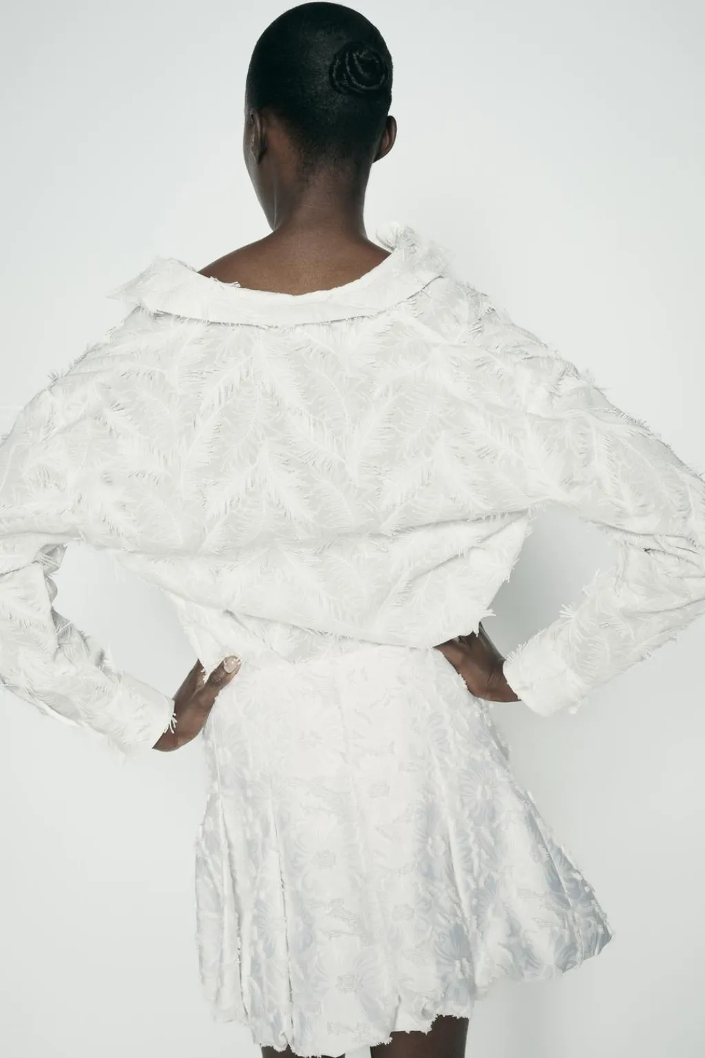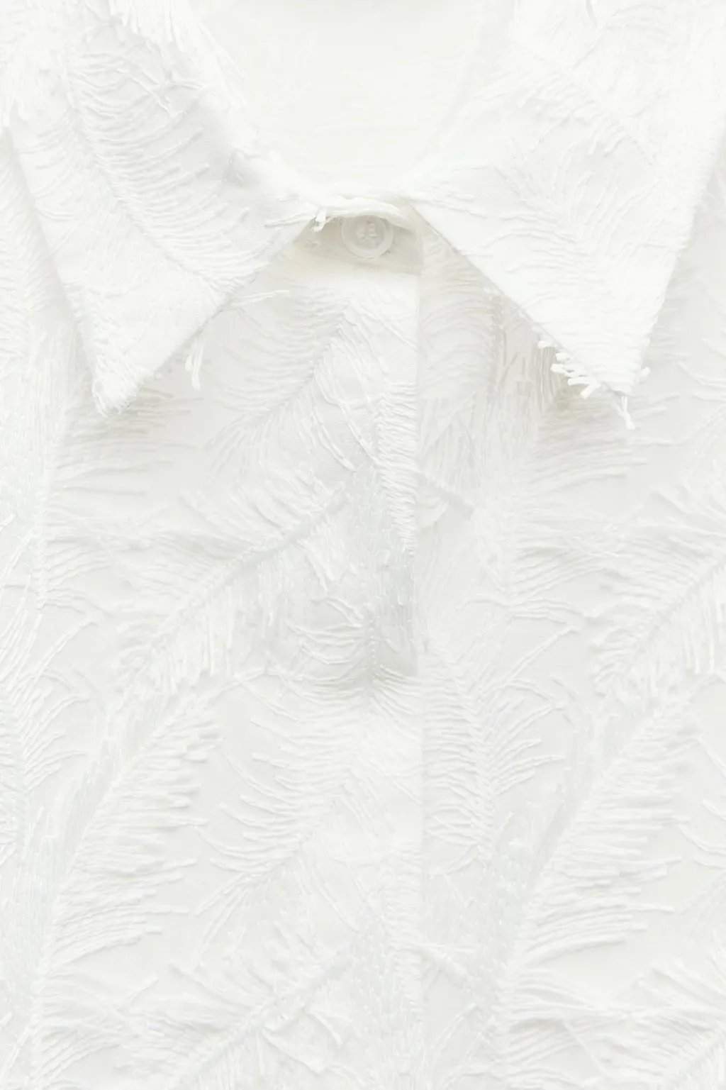 Camisa de cuello solapa y manga larga. Cierre frontal con botones ocultos por solapa.